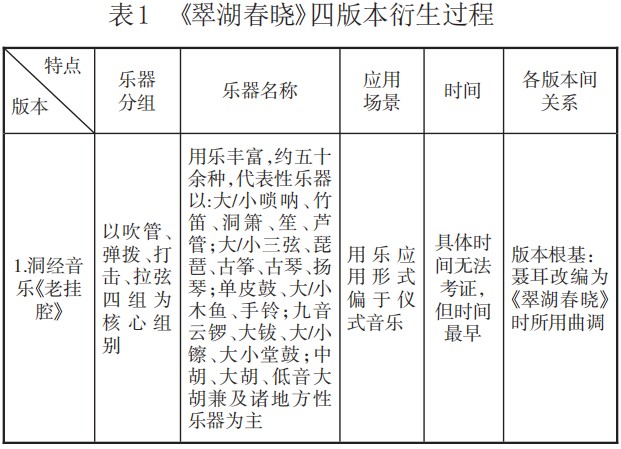 当下对这四部民族器乐合奏曲的专题性研究仅作品《金蛇狂舞》的关联性研究较多,而对《翠湖春晓》的研究则相对薄弱。通过文献耙梳发现,仅桑任的《聂耳的〈翠湖春晓〉与〈老挂腔〉》、安平的《聂耳与民族器乐创作》(《人民音乐》,1985年第4期、第12期)及吴学源的《聂耳与昆明洞经音乐漫谈》(《中国音乐》2004年第3期)与之有一定关联,而针对该曲版本迭代的比较研究却鲜有学者涉猎。因此,本文将以《翠湖春晓》作为主要研究对象,通过综合多方史料搜集、考源的方式对该曲的前世今生做溯源性、系统性研究。鉴于该曲在时代更迭中出现多个版本,因此,笔者亦将对该作品存留的多个版本进行比较研究,尤其对其发展脉络作以系统梳理,以此捋顺中国近现代音乐史中有关该作品的流变及发展。本文的比较研究根基将建立在洞经音乐《老挂腔》之上,而后将依次出现的聂耳改编的《翠湖春晓》雏形、1965年的秦鹏章配器及1985年的刘文金配器版本作以历史性回溯。