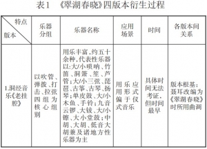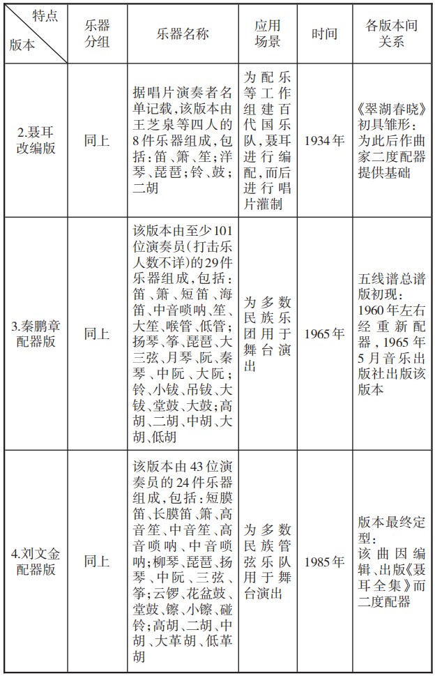 上述内容讨论了《翠湖春晓》的前世今生,尤其将眼光放在其源流与创生过程。而自新中国成立以来,国乐事业有了新的历史突破。作品《翠湖春晓》自此常出现在某些民族乐团中,但却是以仅有旋律声部的简谱形式流传。也许由于演奏需要及曲目自身具有被“经典化”的意义,因而该曲乐队总谱于1965年及1985年分别出版两次,分别由我国两位作曲家作以二度创编并优化原版本中存在的某些不足。为了更好厘清版本间的派生脉络,笔者以《翠湖春晓》相关四个版本为核心,从其乐器分组、用乐、应用场景、时间、各版本间关系五方面作以比较展开,形成下表。自聂耳改编《老挂腔》推出《翠湖春晓》后,新出现的两版本:其一,是20世纪60年代前后由秦鹏章(以下简称:秦版[4])为职业民族乐团重新配器的版本。秦鹏章13岁便加入上海大同乐会从事箫、琵琶演奏,而后作为百代国乐队后期发展的新任琵琶演奏员,参与过乐队多场演出及乐曲录制。因曾与聂耳有过数年紧密合作,因此该版本赓续了聂耳的基本创作理念。在保持原貌的基础上,丰富其和声与复调色彩,于1965年正式出版,其出版扉页写有:“聂耳改编,中央民族乐团秦鹏章和声配器”。该版本的出现影响深远,对作品的发展起到承上启下的重要作用。其二,是恰逢1985年《聂耳全集》初版出版时由作曲家刘文金(以下简称:刘版[5])编配的为四十人及以上的双管编制民族管弦乐队而用的新版本,该版本承继前两版本的良好基础再度修改提高,其出现标志着作品《翠湖春晓》曲谱经典化建构的最终呈现。