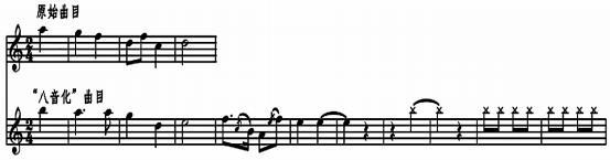 骨干音移位是“八音化”曲目中的高难度技巧,其要求一方面是演奏者对原始曲目、特别是调式走向的深刻熟悉,另一方面是在保持曲目原有风格的基础上实现精准诠释。这一技巧通过对原始曲目的骨干音或部分骨干音进行节奏上的增值或减值处理,从而改变曲目的整体结构。因此,骨干音移位通常适用于需要结构变化的乐段,为曲目增添更多的表现力与变化。