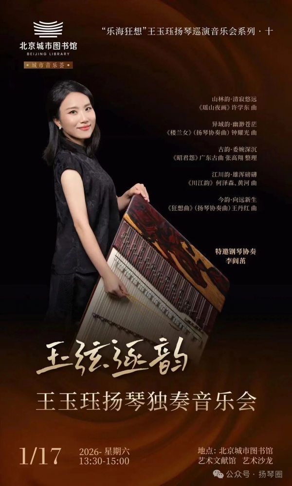 2026年1月17日,“乐海狂想”·王玉珏扬琴巡演系列音乐会·十——玉弦逐韵·王玉珏扬琴独奏音乐会在北京城市图书馆艺术文献馆圆满落幕。青年扬琴演奏家王玉珏演绎五首风格迥异的经典之作,音乐会以“初心-拓界-传承-扎根-未来”为序,特邀李阎茁担任钢琴协奏,为现场观众献上一场兼具东方雅韵与时代活力的民族音乐盛宴。
