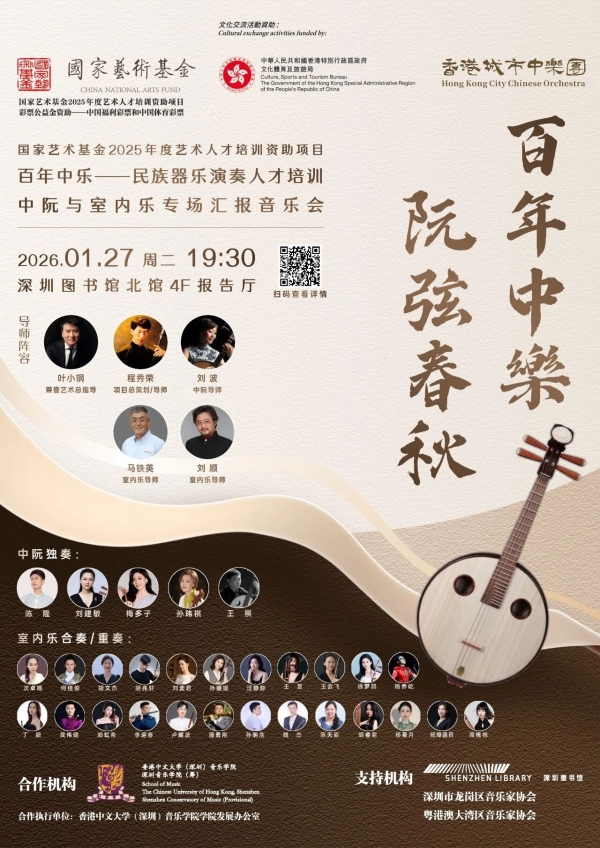 香港城市中乐团荣获“国家艺术基金2025年度艺术人才培训项目”资助,并在香港特别行政区政府的大力支持下,于2025-2026年开展《百年中乐——民族器乐演奏人才培训》项目。 经过2025年8月第一期在香港中文大学(深圳)校区的密集培训,其中包括2025年8月底深港两地的采风考察;此后,9月至12月持续4个月的线上授课;更在2026年元月上旬开展沪苏多地百年中乐发源地、名家名曲、名校名团及民间音乐之深入采风考察和深度交流研讨;目前第二期集中培训正在紧张而有序地进行中,学员们将在2026年1月以系列专场音乐会的方式呈现培训成果。 2026年1月27日晚上19:30,中阮及室内乐专场汇报音乐会“百年中乐 阮弦春秋”,将于深圳图书馆北馆4F报告厅盛大上演!