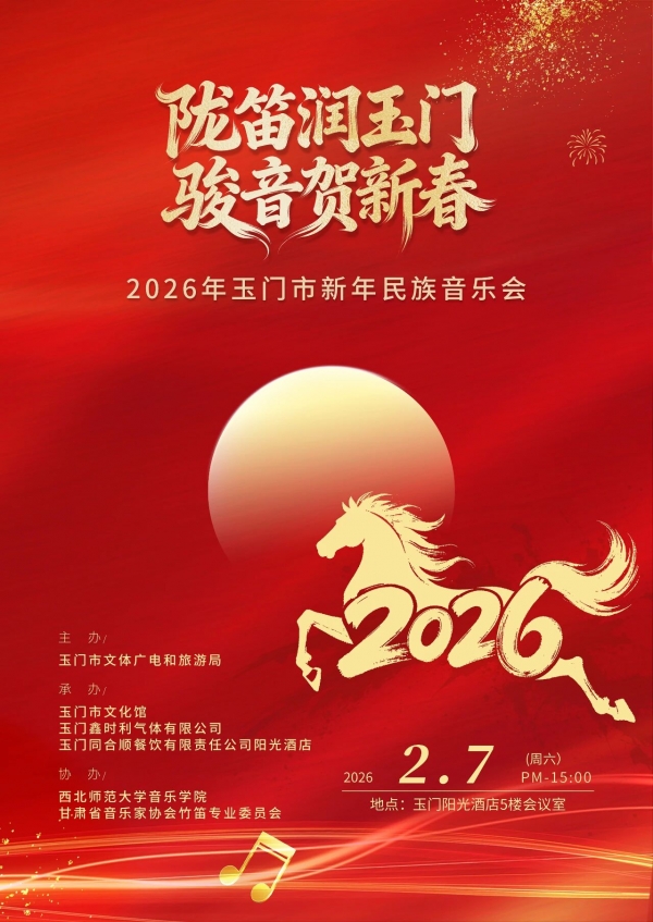 陇笛润玉门 骏音贺新春 2026年玉门市新年民族音乐会 演出时间 2026年2月7日(周六)15:00 演出地点 玉门阳光酒店5楼会议室
