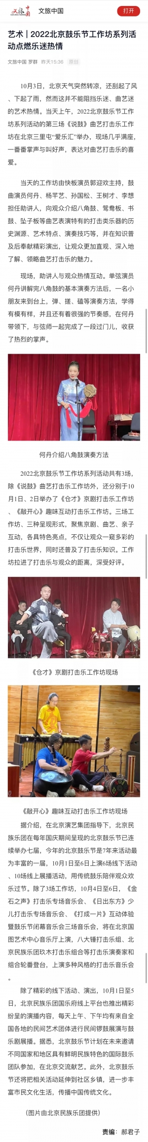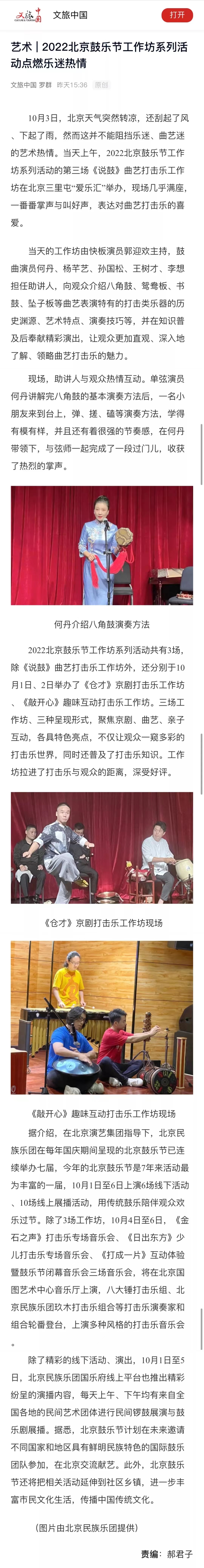 中央电视台音乐周刊、北京电视台、中国文化报、北京日报等各大媒体对2022北京鼓乐节进行报道。