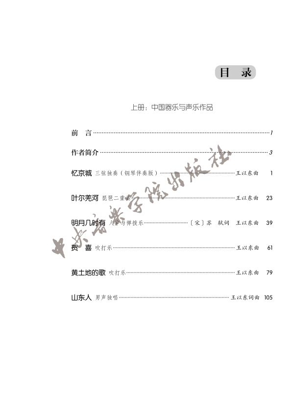 上册包含有钢琴伴奏的三弦独奏《忆京城》,另有琵琶二重奏《叶尔羌河》、人声与弹拨乐《明月几时有》以及作者比较熟悉的题材,民间吹打乐风格的作品《贺喜》与《黄土地的歌》;除此之外,作者尝试创作了歌曲《山东人》,独立完成了词曲创作以及小乐队伴奏的总谱写作。这6首作品题材风格迥异,是作者在专业领域以外的有益尝试。