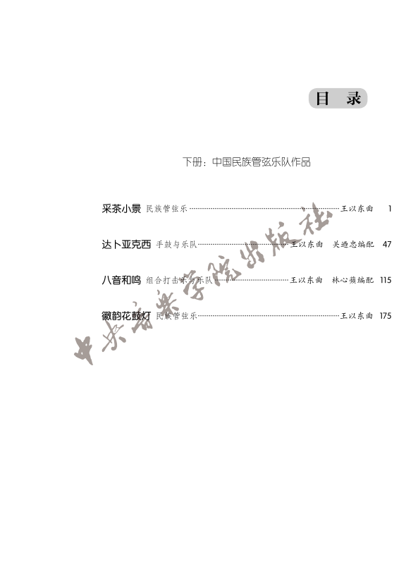下册收录有4部乐队作品,其中两部打击乐与乐队作品,包括《达卜亚克西》(手鼓与乐队)和《八音和鸣》(组合打击乐与乐队),另外两部中国民族管弦乐作品,即《采茶小景》和《徽韵花鼓灯》。