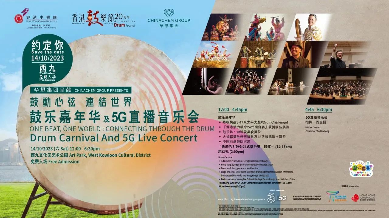 音乐会将透过5G科技现场直播,让全球观众参与其中,现场观众可获赠布朗鼓,同时与乐团及鼓乐名家互动演奏。