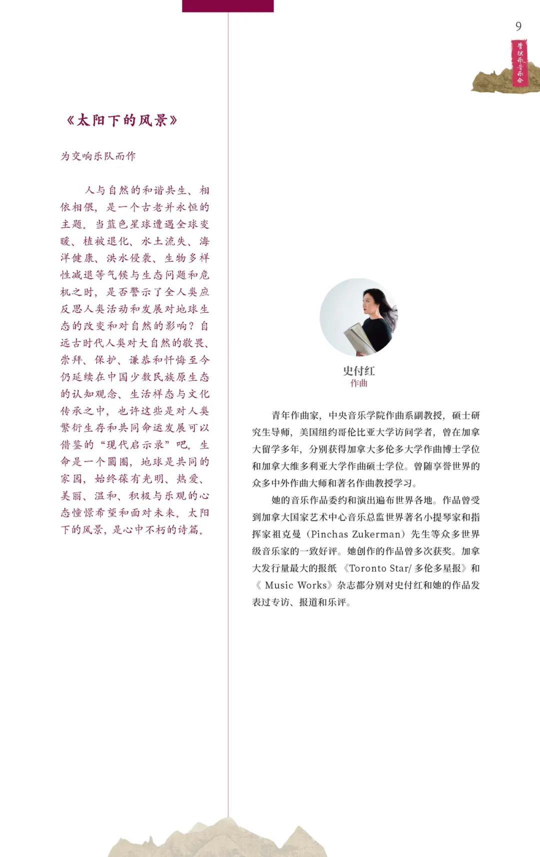 下半场的第一部作品是史付红的《太阳下的风景》,这是一个三管编制的乐队作品。此前,在她的作品《聆听城市》中,史付红探讨了人与城市的关系,在《太阳下的风景》中,她更多地关注了人与自然的关系,“在我们与疫情相伴的这两年里,我们学会了要更多地关注自然。极端天气的增加,更是自然对人类发出的警示,让人类反思哪些人类活动与地球生态发展之间存在矛盾。我们应该学习少数民族对自然的敬畏、保护、谦恭。”