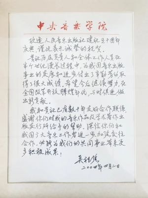 人民音乐出版社将永远铭记先生殷切嘱托和数十年来的信任与支持,与时俱进,不断加强与广大音乐工作者的交往合作,努力为音乐出版事业做出新的贡献。