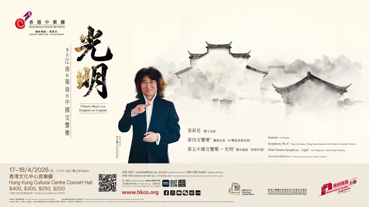 2026年4月17、18日,香港文化中心音乐厅,指挥家彭家鹏将首度执棒香港中乐团,呈献刘文金《茉莉花》、关廼忠《第四交响乐》与刘长远《第五中国交响乐—光明》(香港首演)三部交响力作。这是一场当代民族管弦乐两大 “引擎” 的历史性握手——彭家鹏带着苏州的精致气韵,与扎根东方之珠、融汇中西的香港中乐团碰撞出的艺术火花,值得每一位爱乐者期待。