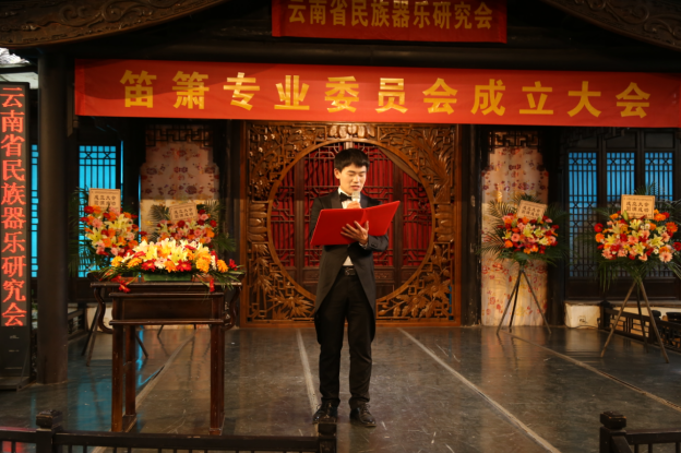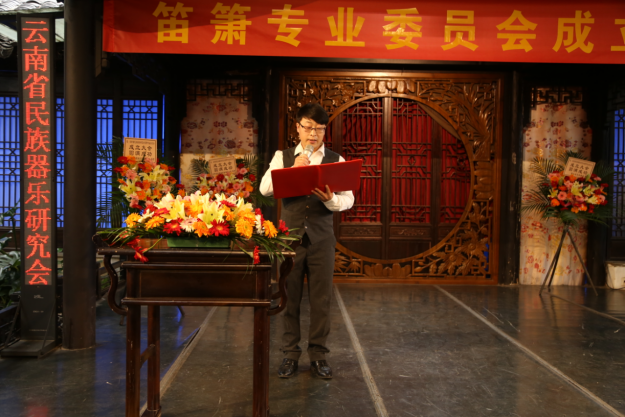 云南省民族器乐研究会秘书长罗岚宣读“关于成立云南省民族器乐研究会笛箫专业委员会的批复”