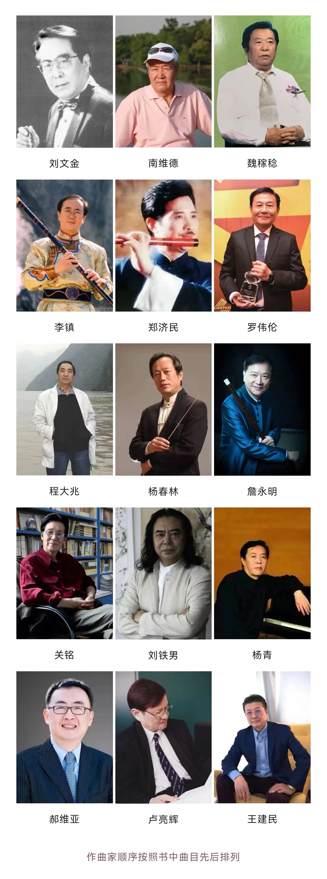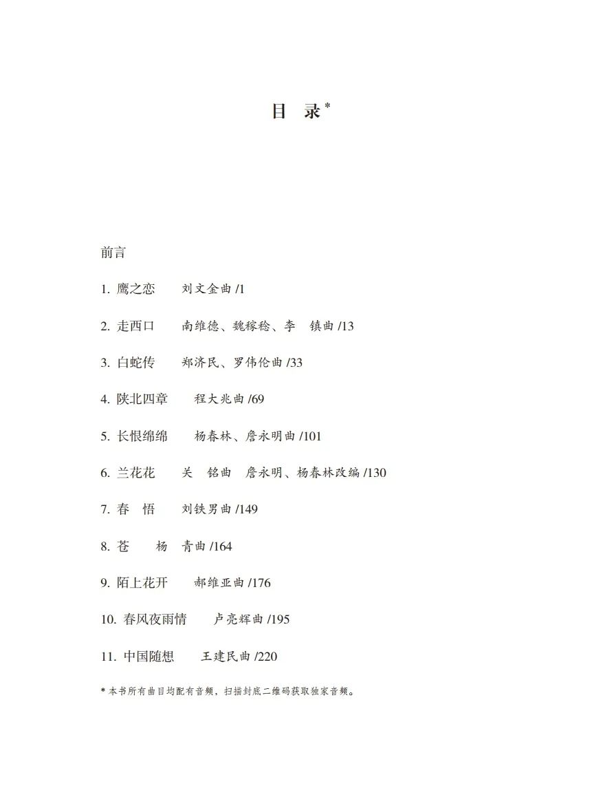 教材收录了 11 首由海内外作曲家刘文金、南维德、魏稼稔、李镇、郑济民、罗伟伦、程大兆、杨春林、詹永明、关铭、刘铁男、杨青、郝维亚、卢亮辉、王建民等创作改编的竹笛协奏曲。