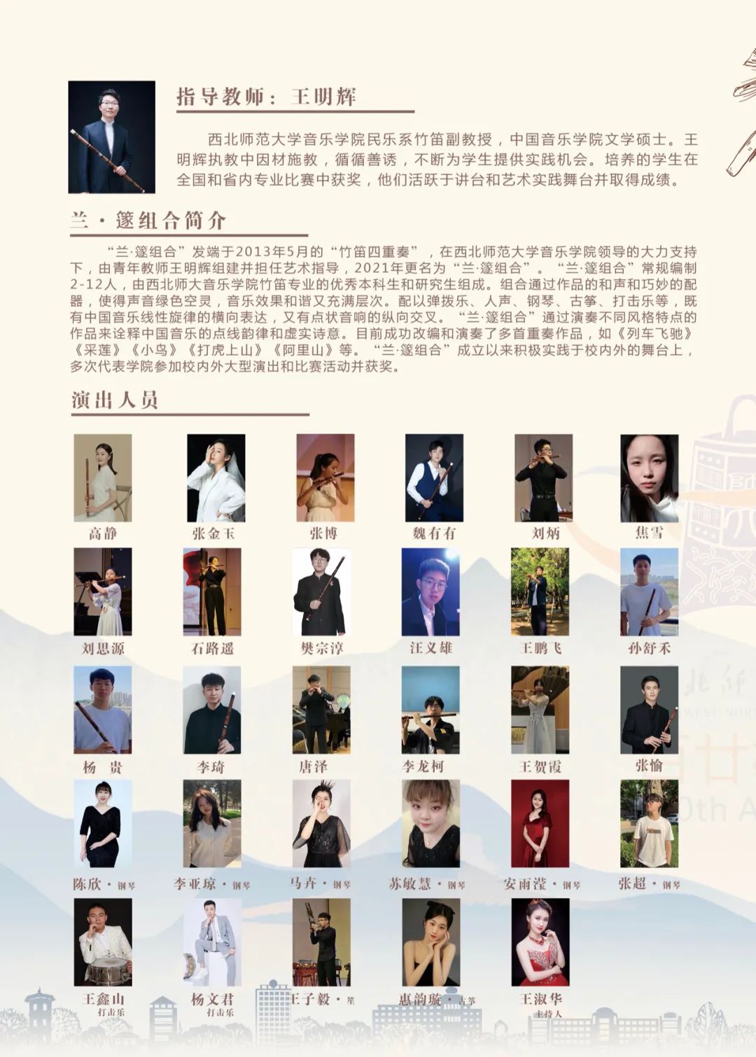 “兰·篴组合”源于2013年5月的“竹笛四重奏”,在西北师范大学音乐学院领导的大力支持下,由青年教师王明辉组建并担任艺术指导,2021年更名为“兰·篴组合”。依“伯氏吹埙,仲氏吹篪”,组合以竹笛为主,兼有箫、埙等乐器。“兰·篴组合”常规编制2-12人,由西北师大音乐学院竹笛专业的优秀本科生和研究生组成。笛、箫、埙的演奏技巧和表现力非常丰富。竹笛家族有梆笛、曲笛、低音笛之分,这些同质乐器放在一起,通过作品的和声和巧妙的配器,使得声音绿色空灵,音乐效果和谐又充满层次。配以弹拨乐、人声、钢琴、古筝、打击乐等,既有中国音乐线性旋律的横向表达,又有点状音响的纵向交叉。“兰·篴组合”通过演奏不同风格特点的作品来诠释中国音乐的点线韵律和虚实诗意。目前成功改编和演奏了多首重奏作品,如《列车飞驰》《采莲》《小鸟》《打虎上山》《阿里山》等。