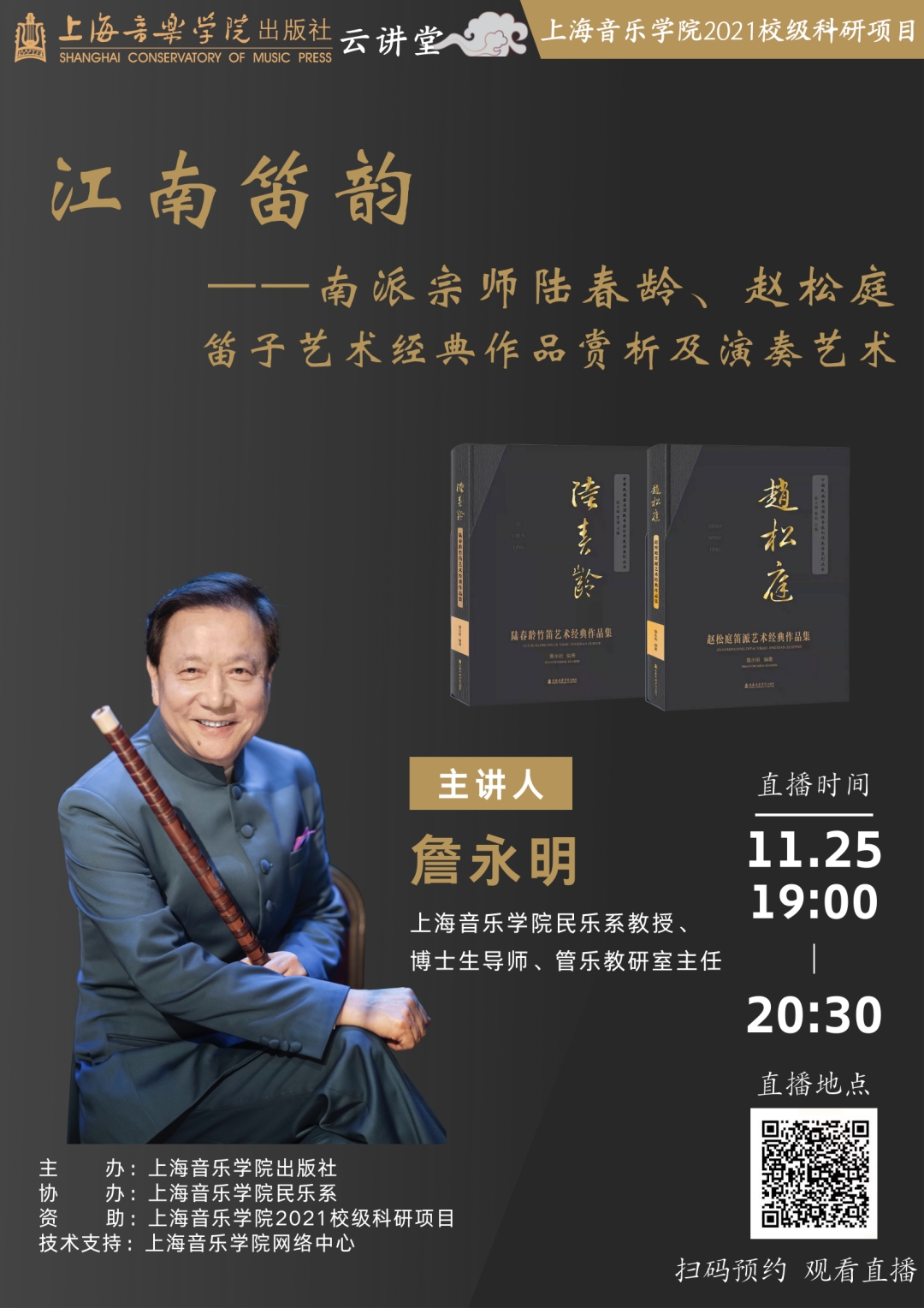詹永明,著名笛子演奏家,教育家。现任上海音乐学院民乐系教授、博士生导师,管乐教研室主任,中国音乐家协会竹笛学会副会长、赵松庭笛子艺术研究会荣誉会长。
