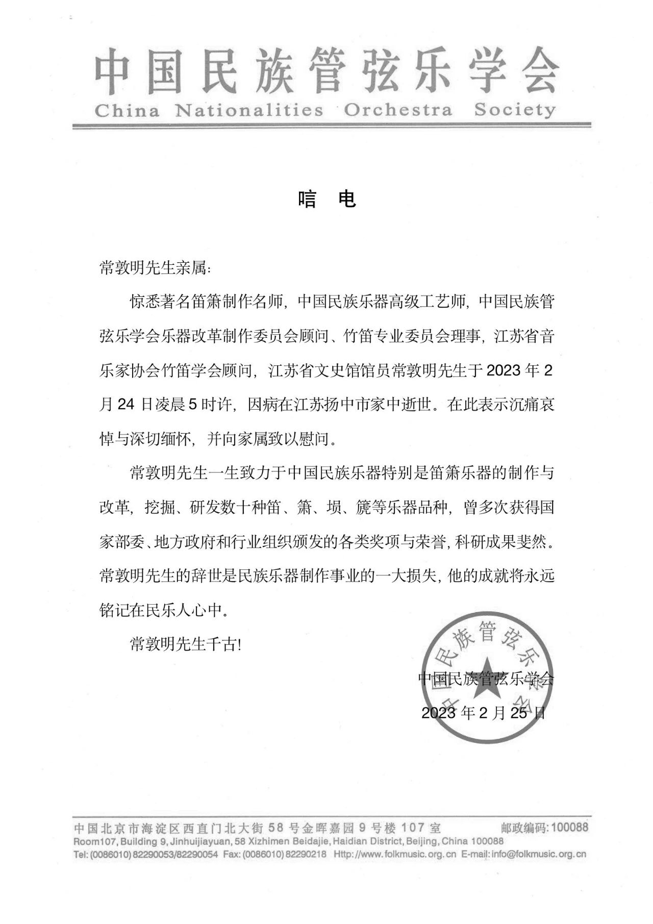 著名笛箫制作名师,中国民族乐器高级工艺师,中国民族管弦乐学会乐器改革制作委员会顾问、竹笛专业委员会理事,江苏省音乐家协会竹笛学会顾问,江苏省文史馆馆员常敦明先生于2023年2月24日凌晨5时许,因病在江苏扬中市家中逝世,享年88岁。