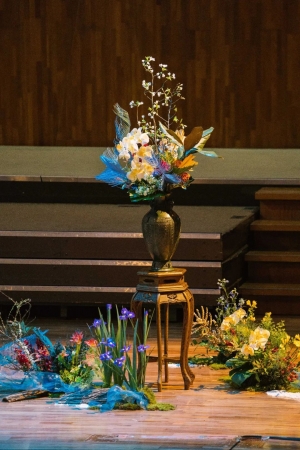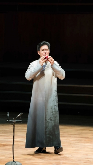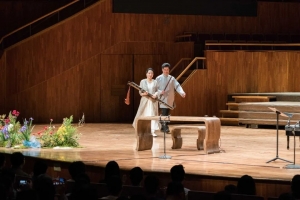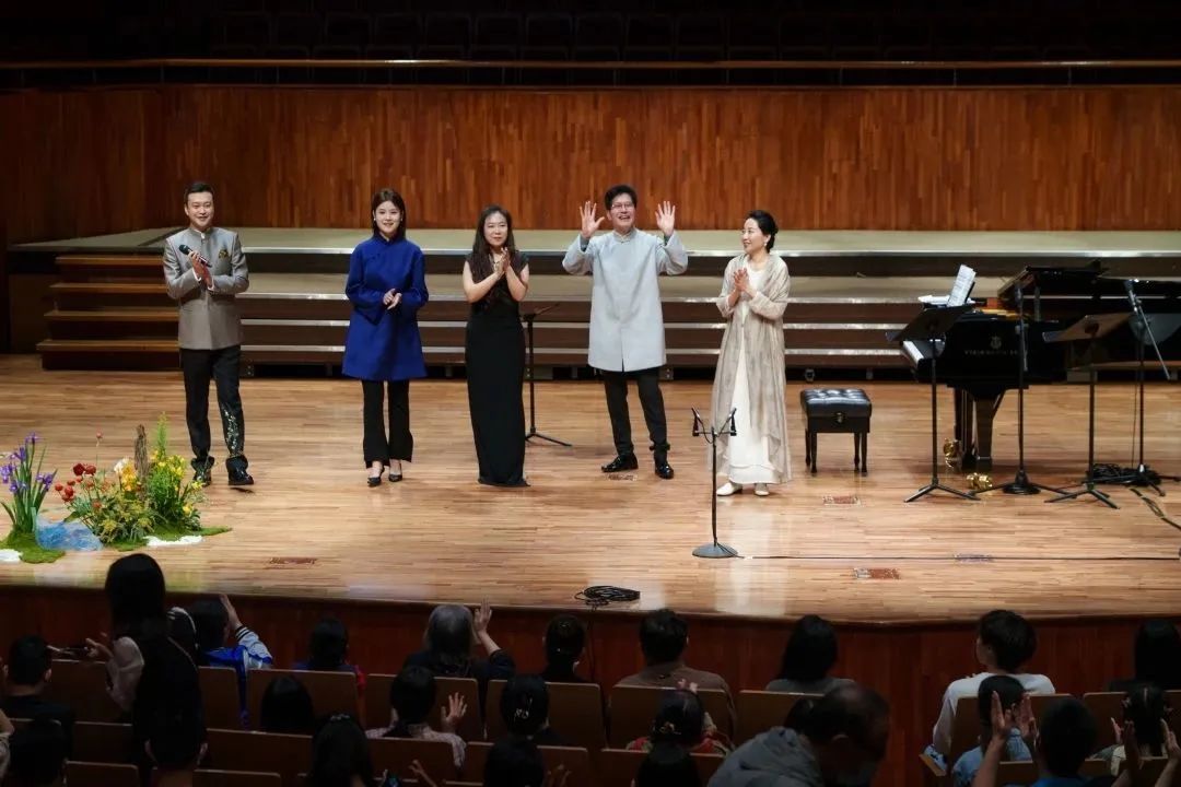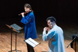 音乐会以古色古香的兰草、木石装点舞台,让乐迷甫一进场就被 “国乐大师” 系列的舞台布置惊艳了一番。开场以《楚歌》古朴、悠远的埙音撩拨观众的怀古情怀,而隐约中可以听见现代的骚动。显然,在金月姣清脆爽朗的钢琴伴奏下,独奏曲《春潮》和协奏曲《飞歌》瞬间开始 “醒” 起乐迷的聆听乐趣。二曲各有个性,但都悠扬动听,欢欣喜悦,说是可以闻见春天的气息也不算夸张。唐建平以苗族音乐素材创作的《飞歌》有着丰富的音乐形象,大G调和小G调的笛子轮流使用,仿佛听见响彻云霄的歌飞鸟鸣,看见了戏剧性的舞蹈场面和山间迷人的皎洁月色。