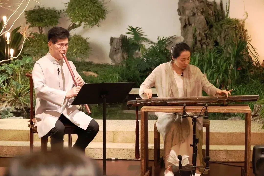 除了音乐会以外,在音乐会前一晚,张维良和成红雨出现在全新的 “四季雅乐集 · 春江月夜” 现场,在富有岭南园林特色的白天鹅宾馆总统套房空间,与观众分享了笛、箫、埙、琴的艺术魅力,畅聊国乐传统和创新的妙趣。二人现场演绎的《夕阳箫鼓》(又名《春江花月夜》)《梅花三弄》等经典作品余音绕梁,加上白天鹅宾馆精制的多款春日特色点心和三道茗茶,经典国乐与岭南美食文化巧妙相融。