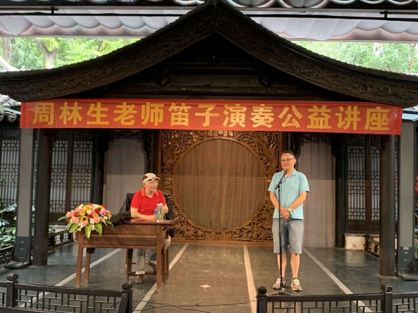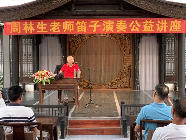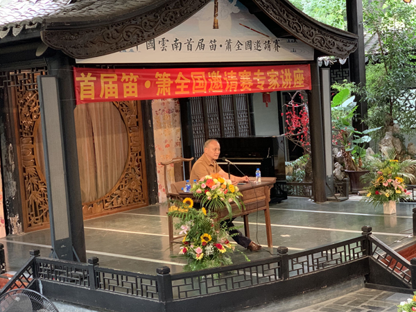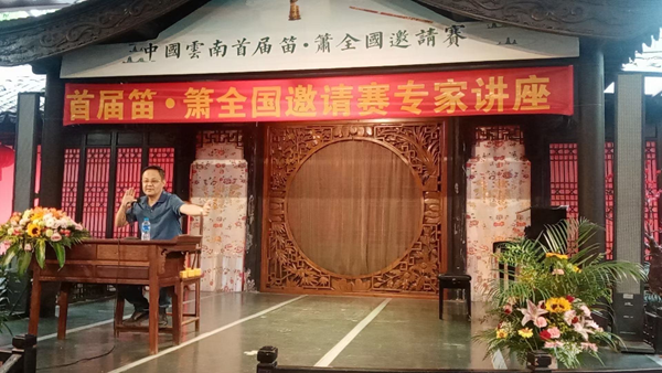 六、8月14日14:00到17:00邀请赛系列活动周林生公益讲座也是邀请赛的最后一个活动,周老师从学习简广易先生的“牧民新歌”谈对刘森先生笛韵的体会。周老师现场演奏了牧民新歌并且给听讲座的很多学生给予了详细的指导,讲座快结束的时候周老师还介绍了尺八这个乐器,并表示尺八是中国的乐器。最后由郑强老师讲话表示了对周老师的感激,讲座在大家的热烈掌声中结束。周老师的讲座对于云南笛箫的发展犹如雪中送碳,虽然只是短短的几个小时但是让现场的老师和学生对经典传统曲目的传承有了更高的认知和学习方向。