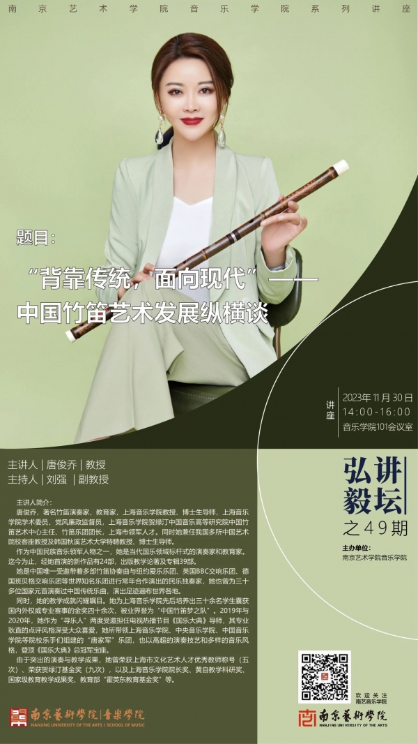 著名竹笛演奏家、博士生导师唐俊乔教授竹笛艺术讲座《背靠传统、面向现代——中国竹笛艺术发展纵横谈》将与2023年11月30日(周四)下午14:00-16:00在南京艺术学院音乐学院101会议室举行。