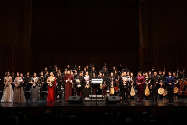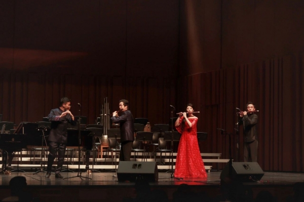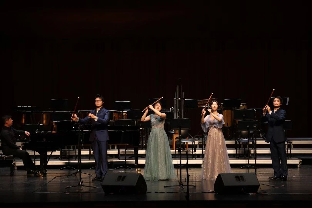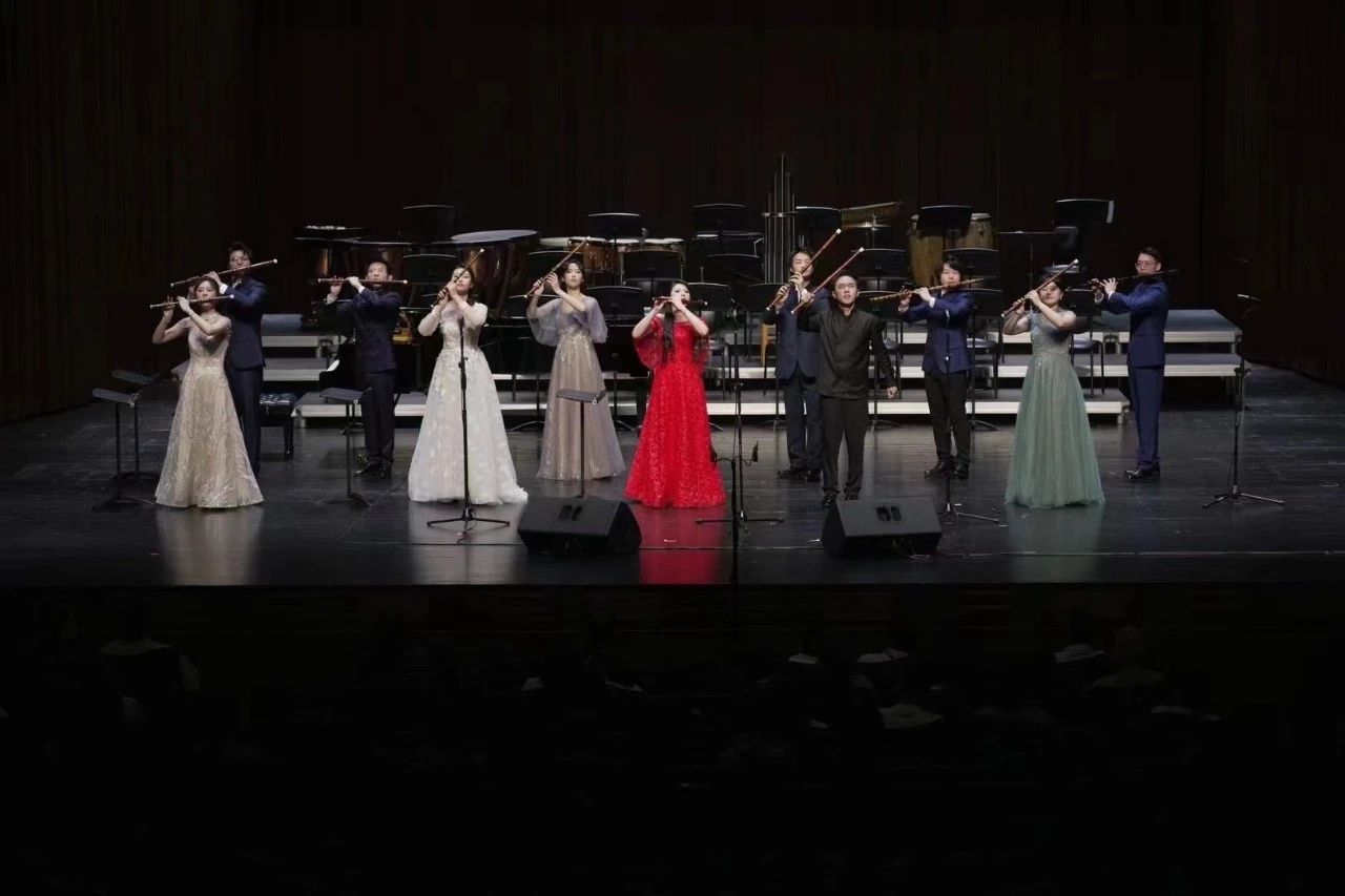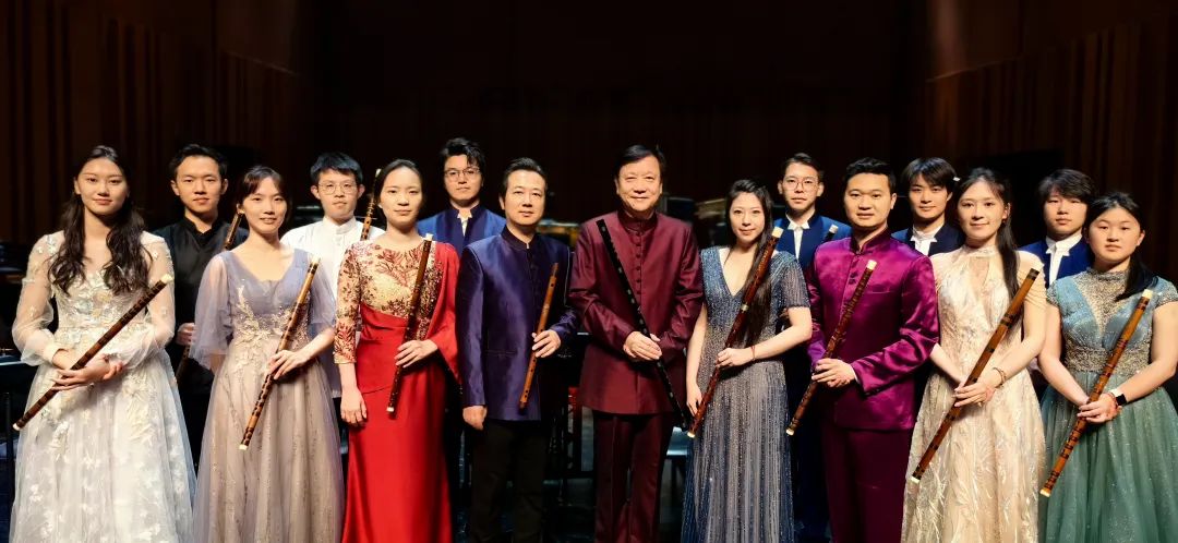 获国家艺术基金项目支持的《祁连音画》创作者卢耀波目前正攻读上音博士研究生,本次上演了其中的《飘雪》《舞沙》《乌岭》,具有极佳舞台效果。此外,他还专为音乐会创作了《梧影婆娑》(四重奏)致敬恩师与母校。来自中国香港的青年演奏家龚伟健已在内地学习多年,正在上音读博的他在老师詹永明鼓励和指导下,创作了《铜锣湾随想》《维港风情》于本次音乐会首演。两部作品以极富时代感的语汇与风格,描摹都市文化生活的多个侧面,不落俗套又与传统笛乐表现形式高度契合。协奏曲《春色映征程》由上音校友郑金珠创作,作品以浓郁的地方音乐风格与鲜明主旋律特征抒发对党的无限热爱。本次以民族乐队形式重新编配演绎。《柳》《梦的呼唤》由硕士生张明艺创作,采用室内乐形式呈现,颇有新意,对不同织体、体裁的笛乐表现可能性作出有益探索。由詹永明本人创作的《春逝》,在原本“独白”版本的基础上创编为三重奏,表达了对恩师赵松庭、陆春龄的深深思念之情,以此呈现三代笛家的传承。