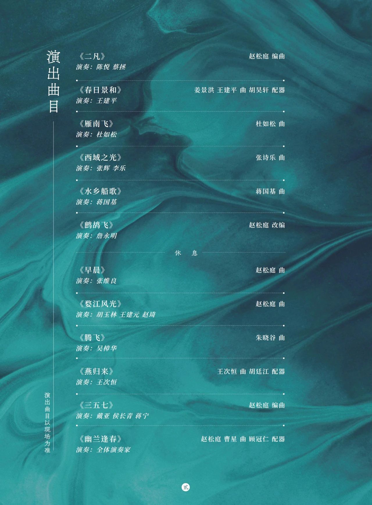 当晚的音乐会汇聚了来自全国各地的竹笛名家与业界同仁,著名指挥家张列担任指挥,中国广播民族乐团担任乐队协奏,中央广播电视总台著名主持人张泽群担任主持。音乐会上,著名笛子演奏家蒋国基、詹永明、张维良、戴亚、王次恒、杜如松、吴樟华、王建平、陈悦、王建元、蔡拯、侯长青、胡玉林、张辉、李乐、赵琦、蒋宁等诸多竹笛名家、赵松庭先生的弟子及再传弟子纷纷登台,为观众带来了《二凡》《鹧鸪飞》《早晨》《婺江风光》《三五七》《幽兰逢春》等赵松庭先生的代表作,以及《春日景和》《雁南飞》《西域之光》《水乡船歌》《腾飞》《燕归来》等多首笛子艺术佳作。竹笛名家们用精湛的技艺和深情的演绎,将赵松庭先生的经典作品和艺术精神予以充分的展现,他们的演奏时而激昂热烈,时而温婉细腻,让观众感受到了笛子艺术的独特魅力,点燃了大家喜爱民族音乐的热情。