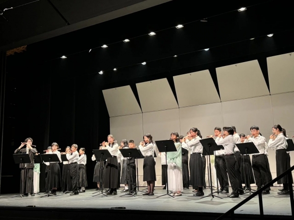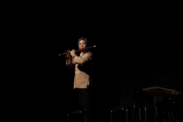 下半场由杨伟杰博士演奏的《花泣》与钢琴伴奏相融,情感流畅如行云。朱绍威、曾庆基、杨伟杰、陈敬臻和姚敢为五位师兄弟共同演奏张向华的《丝丝泪》,以李商隐的诗为灵感,深情表达对恩师的怀念。王奕熹与初中级学员演绎的《承传入门》生动活泼,选自《笛子入门》的四首乐曲。香港竹笛学会演奏的《都市雀鸣》展现了现代城市的笛韵,丝竹之声穿梭于楼宇之间。杜如松教授以洞箫演奏《幽兰》,缅怀赵松庭先生。最后,詹永明教授演奏由他所创作的《婺江欢歌》将音乐会推向高潮,声音高亢洒脱,并特邀他的学生上海音乐学院在读博士生龚伟健(港籍)同台演出,体现出赵派再传弟子笛艺薪火相传。整场音乐会演奏家们通过音乐表达了深切的怀念与感激之情。在音乐会尾声,大家共同演奏《三五七》,象征着对松庭精神的延续与传承。