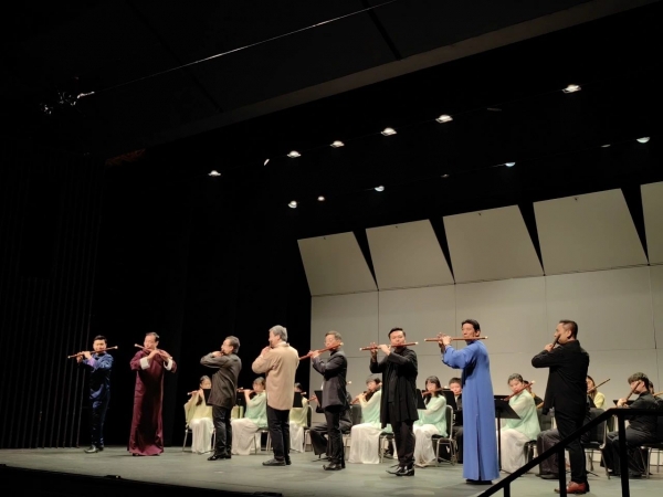 音乐会的上半场由朱绍威以《早晨》开场,抒发情感,展现南北笛技的融合。陈敬臻演绎的《幽兰逢春》表达了深厚的情怀,这首乐曲是赵松庭先生为纪念周恩来总理创作的经典之作,隐喻他的一生。杜如松教授演奏的《雁南飞》追忆恩师,笛声悠扬余韵绵长。曾庆基演奏的《水乡船歌》则展现了江南的灵秀,歌谣动人。詹永明教授演绎的《鹧鸪飞》细腻婉约、江南韵味十足的曲调把乐曲的意境演绎得惟妙惟肖。