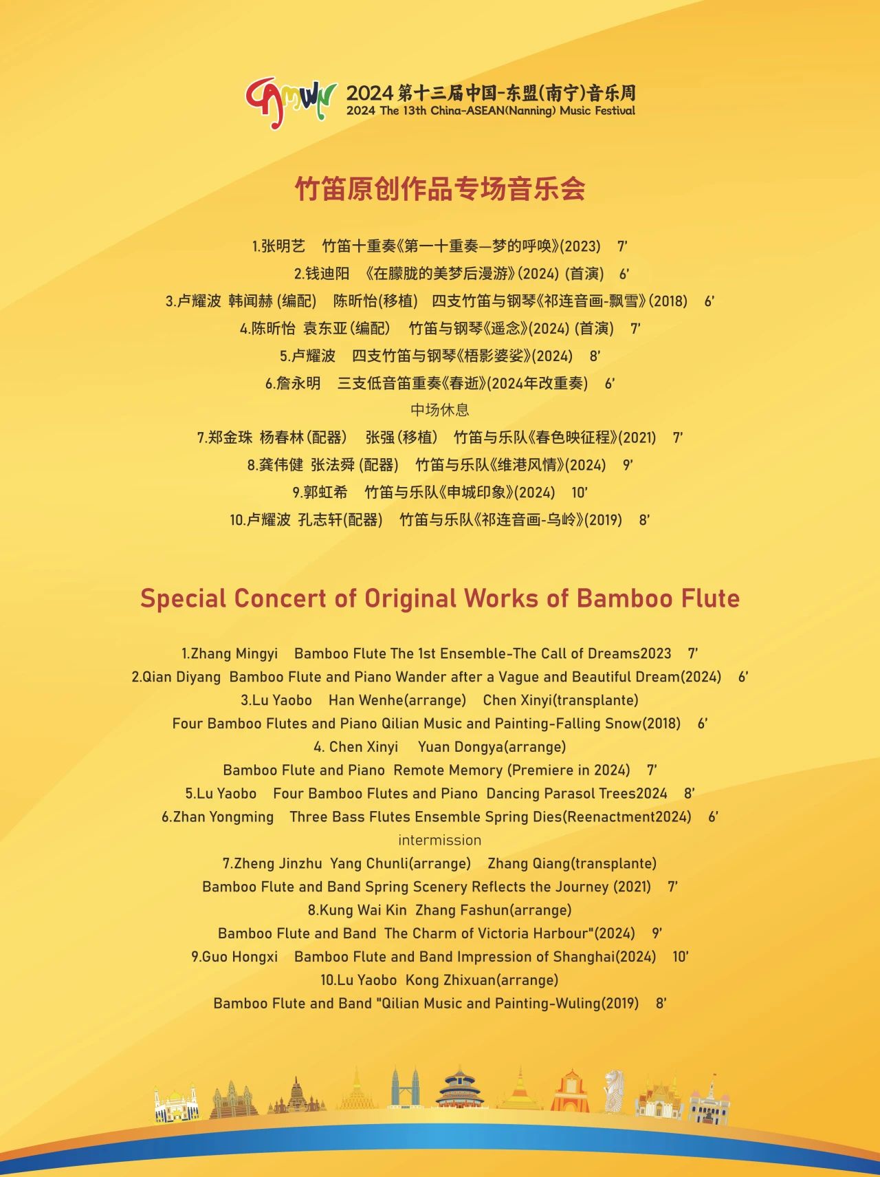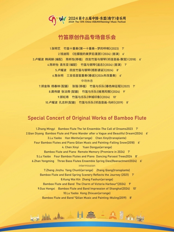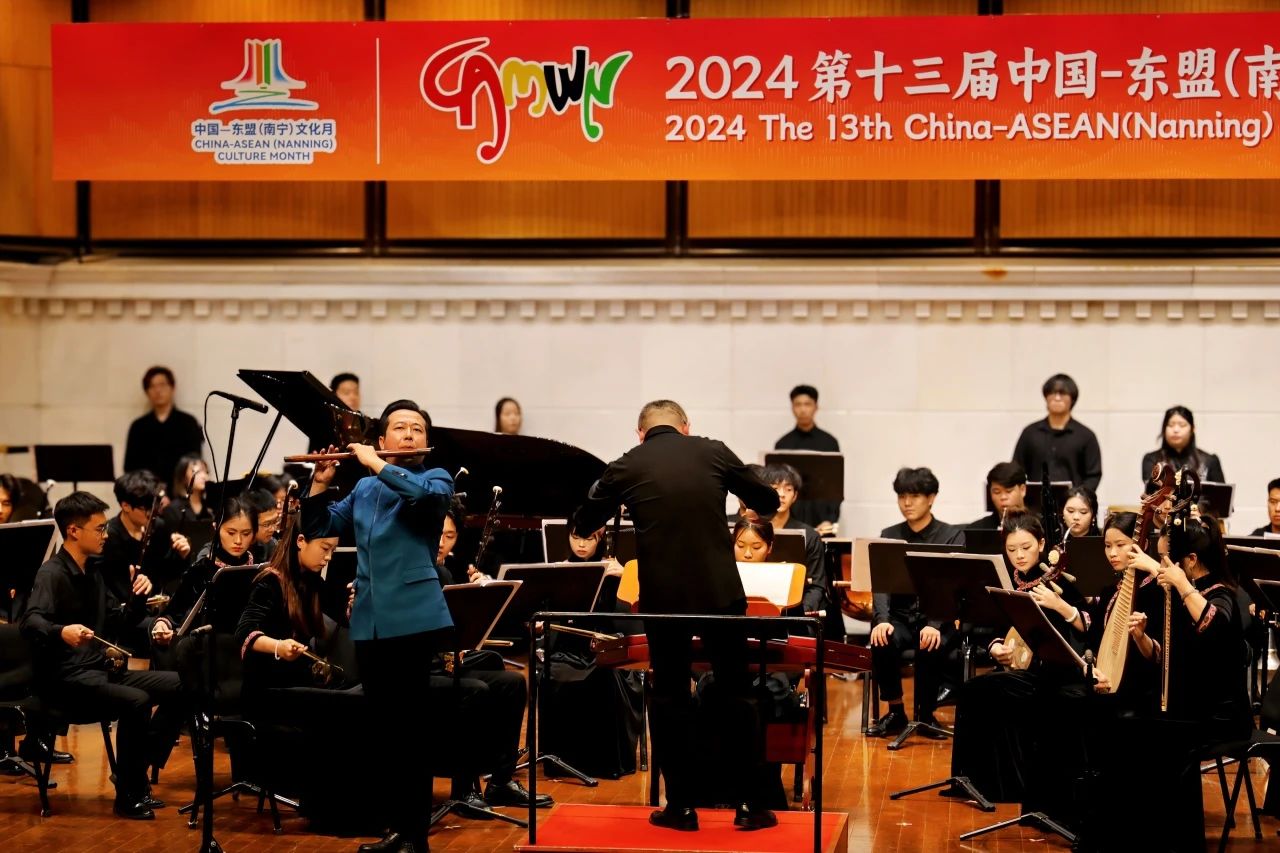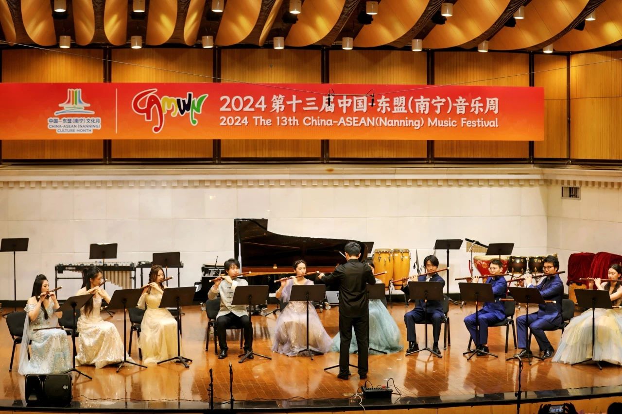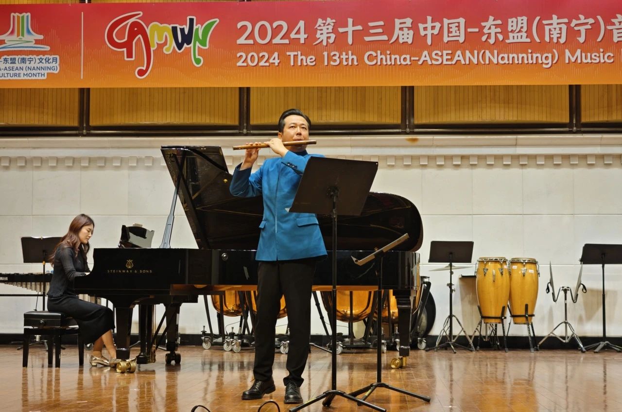 2024年11月,由南宁市人民政府、广西艺术学院、广西国际博览事务局联合主办的第十三届中国-东盟音乐周在广西·南宁盛大开幕,11日下午,由上海音乐学院詹永明教授竹笛团队带来的竹笛原创作品专场音乐会在音乐周中精彩上演。本场音乐会的亮点在于大部分演出作品均出自詹永明教授及其门下弟子之手,它们不仅展现了詹教授在竹笛教学领域的深厚造诣,更是他数十年如一日辛勤耕耘的丰硕成果的集中展现。