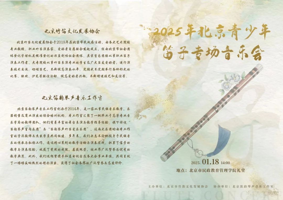 2025北京青少年笛子专场音乐会于1月18日下午在北京民政教育管理学院成功举办,本次活动由北京竹笛文化发展协会主办、北京笛韵琴声音乐工作室协办。