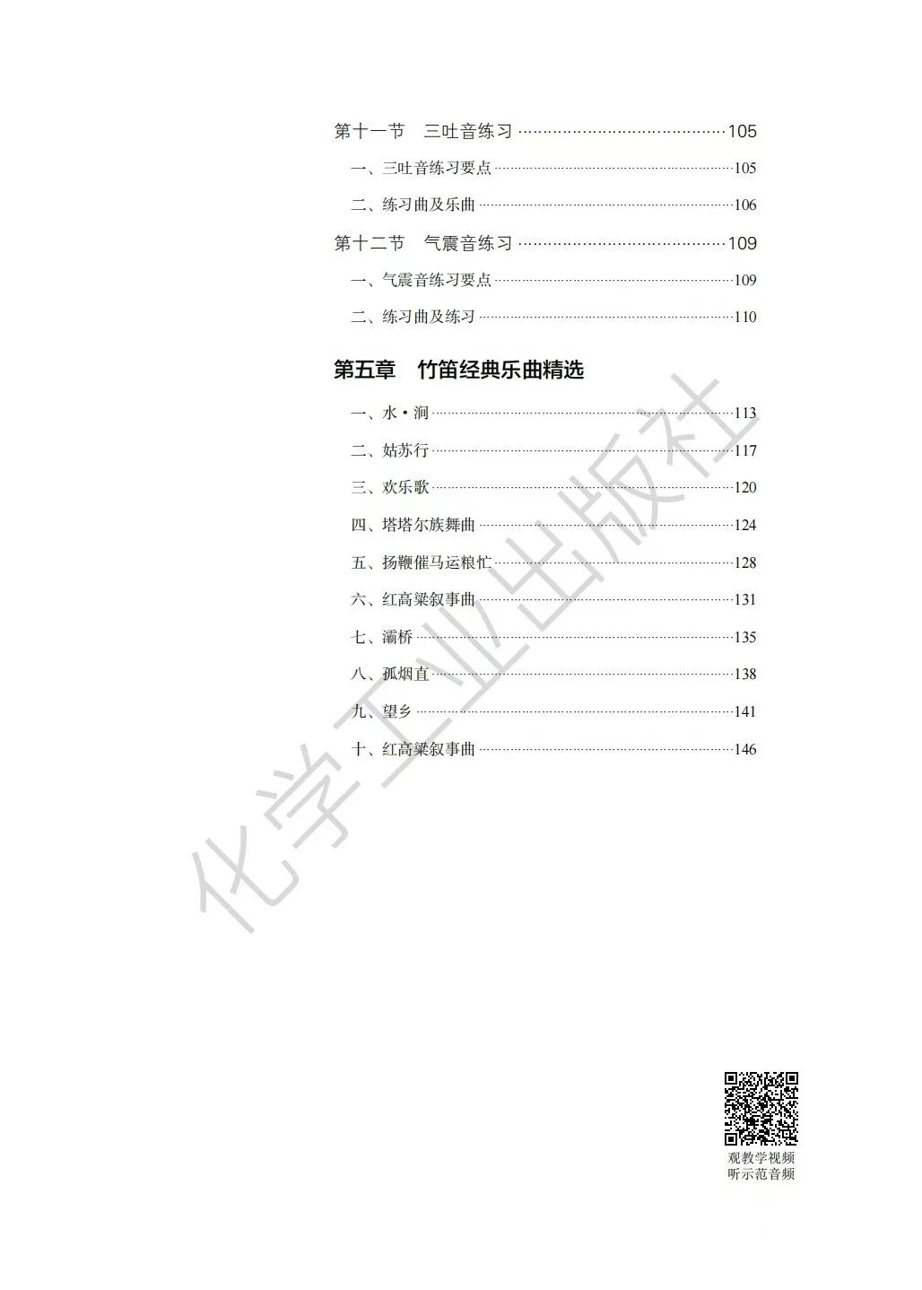 全书遵循“认识笛子→吹奏基础→入门练习→提高练习→经典乐曲精选”的阶梯式结构,从“基本音吹奏”到“气息与运指技巧融合”,从《扬鞭催马运粮忙》《姑苏行》等经典曲目再到原创作品《水•涧》的情感表达训练,帮助练习者逐步摆脱“机械吹奏”,真正学会用竹笛传递音乐情绪,最终成长为能独立演绎《红高粱叙事曲》《望乡》等作品的竹笛爱好者。