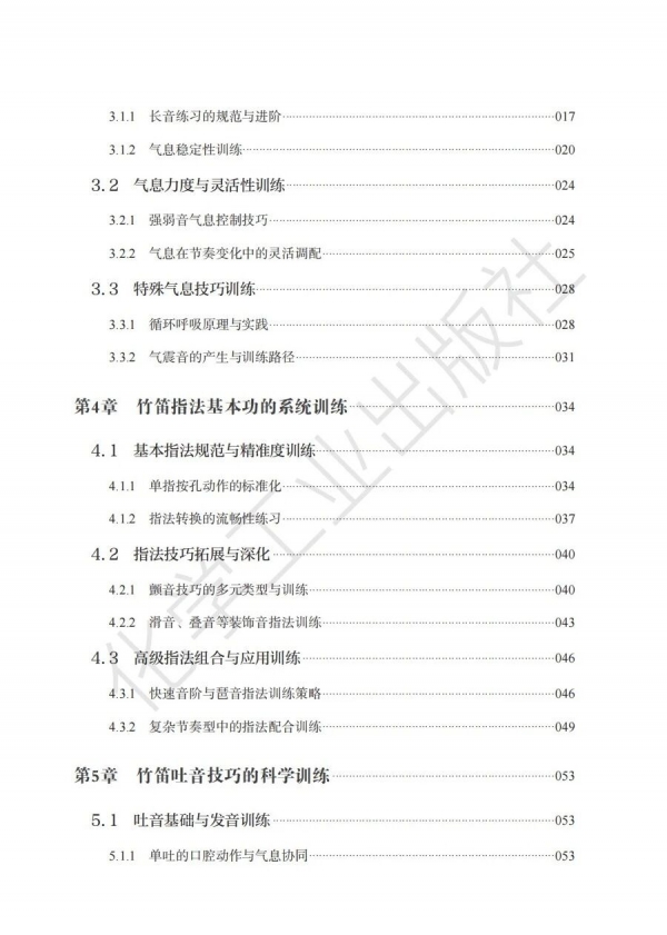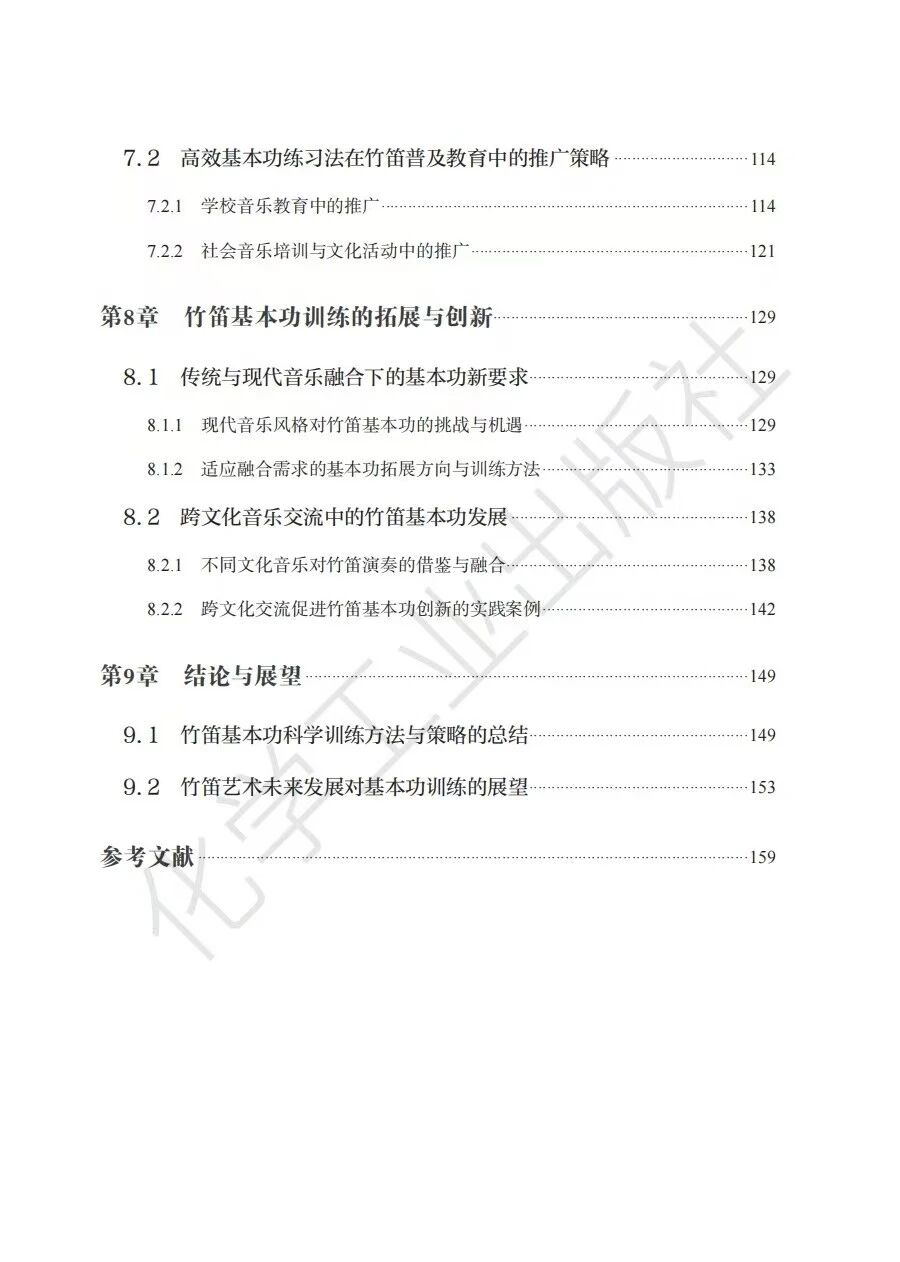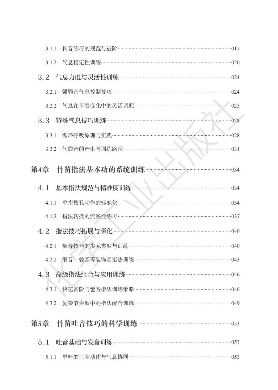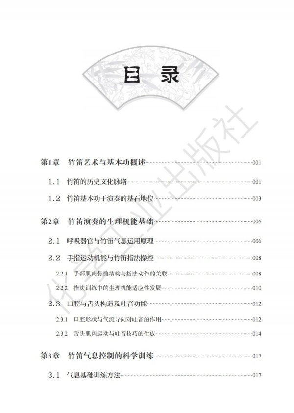 本书作为探究竹笛演奏技巧与理论方法的学术著作,以科学视角系统构建竹笛基本功三阶训练与创新拓展体系。从竹笛历史文化溯源,阐明基本功的核心价值;继而深入演奏生理机能底层逻辑,从气息、手指、口腔等维度解析演奏生理机制,为科学训练奠定理论基石。此外,本书还立足现代音乐风格对竹笛基本功的挑战与机遇,探索不同文化音乐与竹笛演奏的借鉴融合,为传统技艺注入时代与跨文化活力。全书多角度系统阐释竹笛基本功训练命题,结合生理学、心理学等学科知识,为竹笛学习者与教学者提供指导。