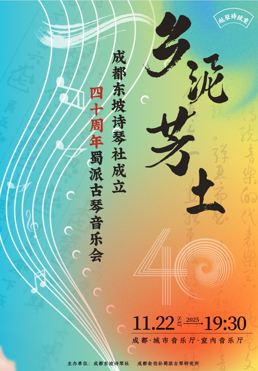 东坡诗琴社自1985年成立迄2025年已历尽40周年。全体东坡诗琴社成员将一齐登台,共同成就蜀派古琴艺术风貌。