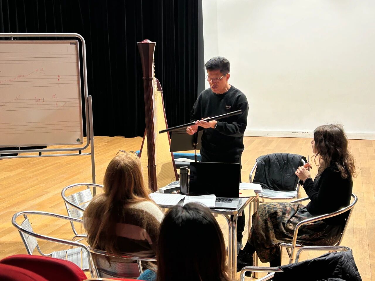 通过讲解笛箫乐器的音程、音区、音域等基本原理。这些内容对他们来说,虽然十分陌生但很期待。大家学习的热情很高,经过长达四个小时的授课,学生们受益匪浅,拼命做笔记,还积极提问。要求一个月之后,他们将笛箫乐器融入到自己的创作作品中,也就是说,接下来一个月之内,他们的作品里要有中国乐器,这对他们来说是全新的创作体验,可喜的是昨天就收到有的学生寄给我她们写完成的作品,采用笛与竖琴的形式呈现。