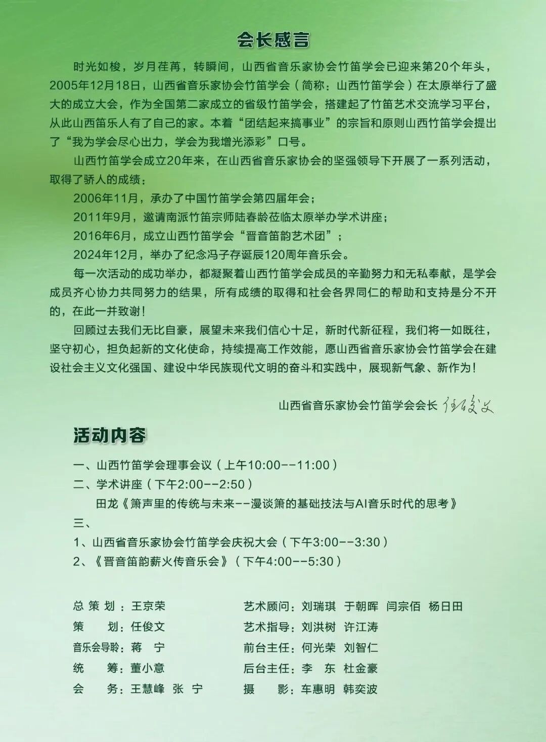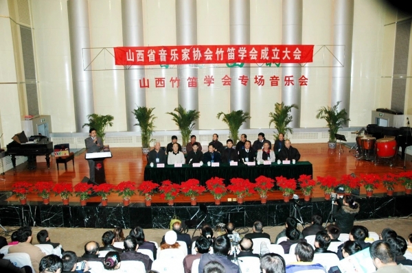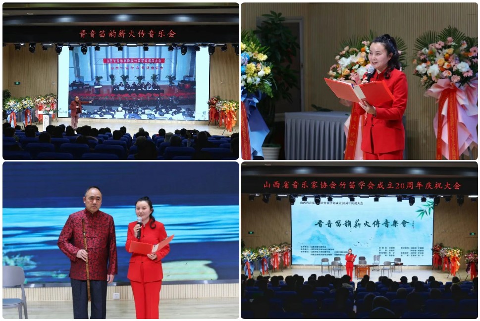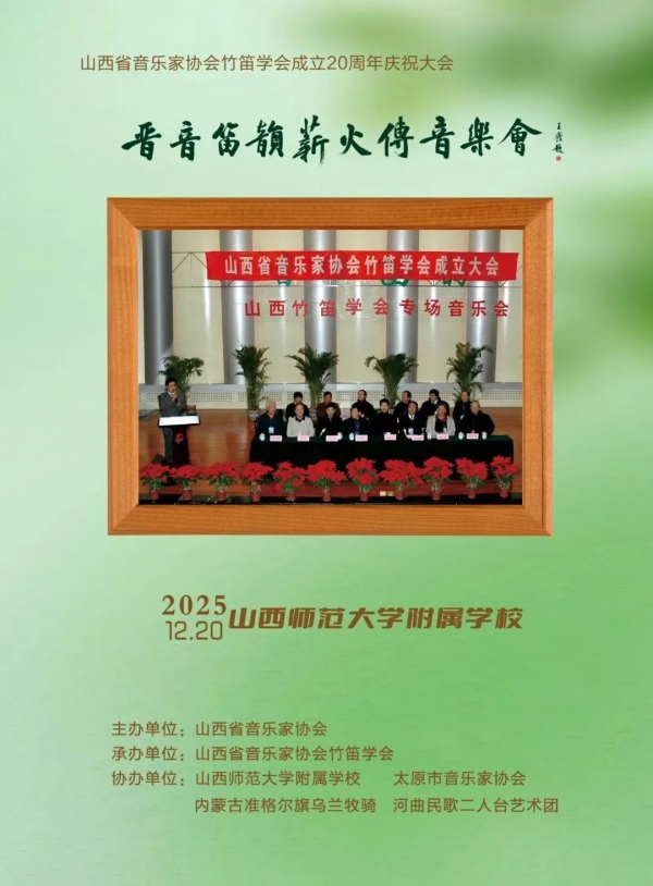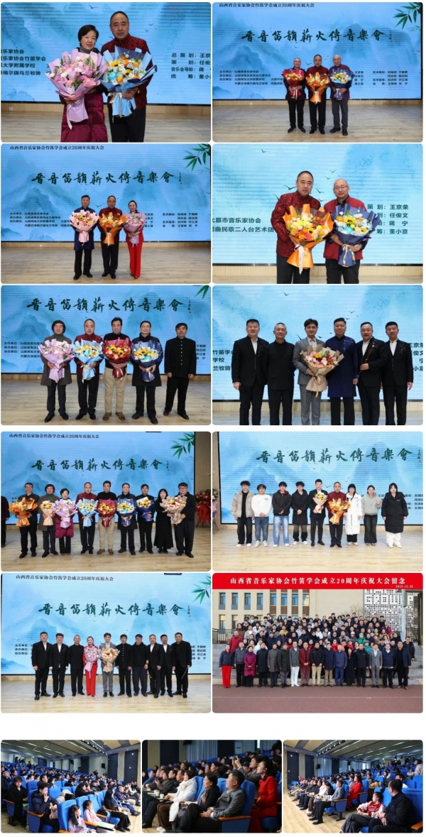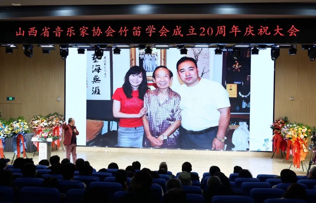 在下午三点山西省音乐家协会竹笛学会庆祝大会上,会长任俊文登台致辞,全面回顾学会二十载发展历程与丰硕成果,深情缅怀老会长邬满栋先生,向长期关心支持学会成长的老一辈笛子演奏家致以诚挚敬意。会后,全体与会人员合影留念,定格这一意义非凡的时刻。