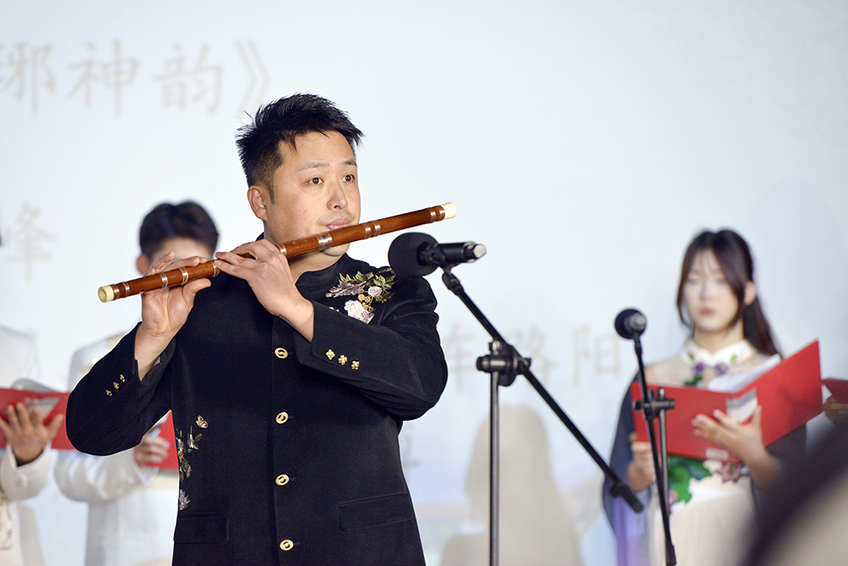 演出环节中,滁州学院音乐与教育学院秦峰老师演绎的竹笛独奏《琅琊神韵》,以清越悠扬的笛音再现了当年俞逊发先生独宿古寺、以笛写心的创作情境。该曲诞生于20世纪80年代,俞逊发先生于琅琊山醉翁亭畔静思数日,将欧阳修《醉翁亭记》中“山水之乐”化入笛韵,并创新融入“指击音”“哨笛音”等技法,使该曲既有古典意蕴,又具时代气息,成为中国竹笛艺术的重要代表作。