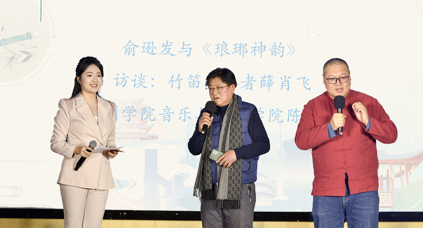 访谈环节中,俞逊发先生生前好友、该曲传播的重要推动者薛肖飞,与滁州学院音乐与教育学院陈宝利老师共同回顾了《琅琊神韵》从创作到传播的动人历程。薛肖飞特别提及自己多年来坚持在琅琊山演奏此曲、推动曲谱立碑的故事,彰显了一代人对地方艺术传承的自觉与执着。陈宝利则从音乐学角度分析了该曲的结构特色与人文价值,指出其成功实现了“从文学意象到音乐语言”的创造性转化,成为连接滁州历史与当代的文化纽带。