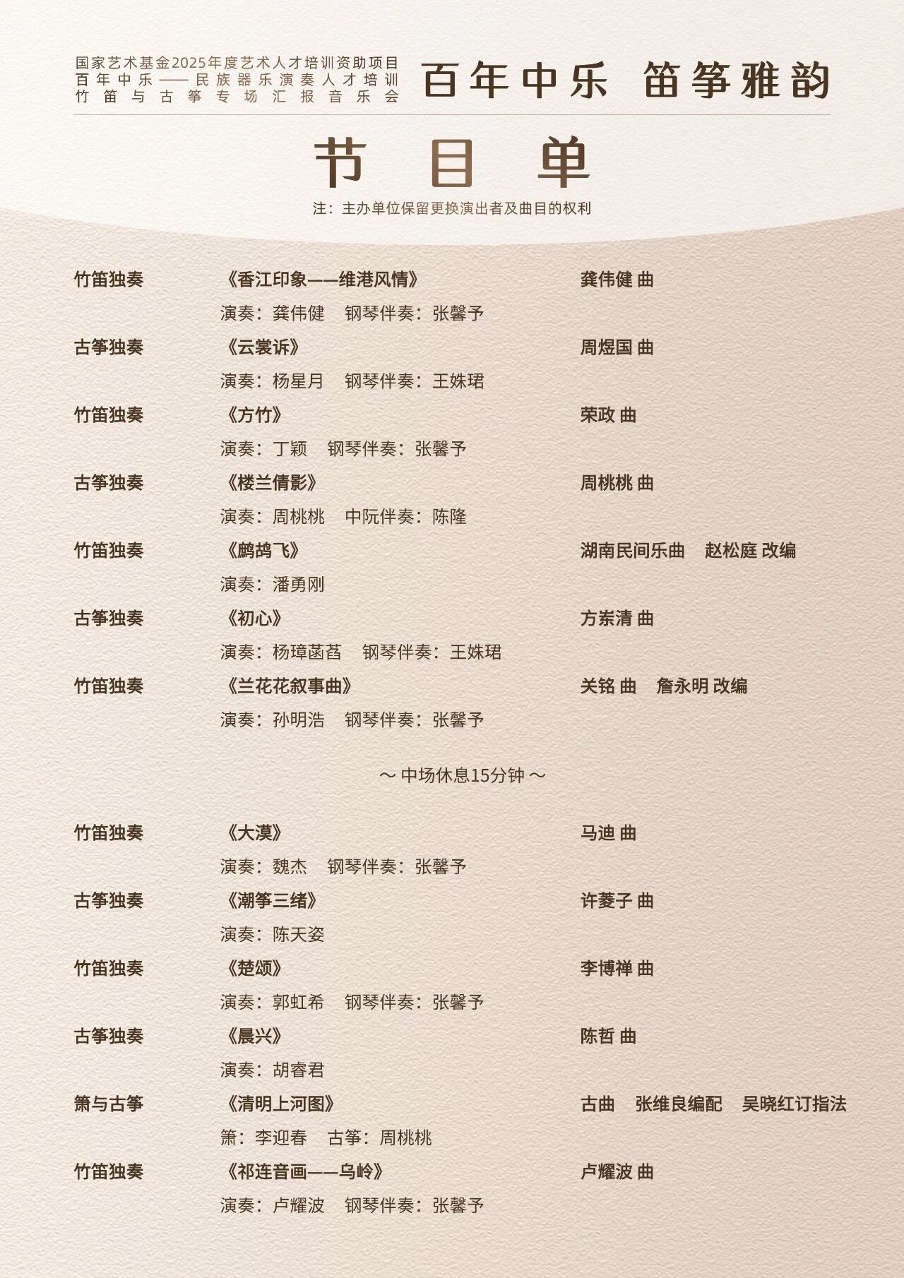 本次音乐会的演出阵容包括《百年中乐——民族器乐演奏人才培训》项目竹笛及古筝专业全体学员,13位来自五湖四海的青年演奏家们同台献艺,必将精彩纷呈!