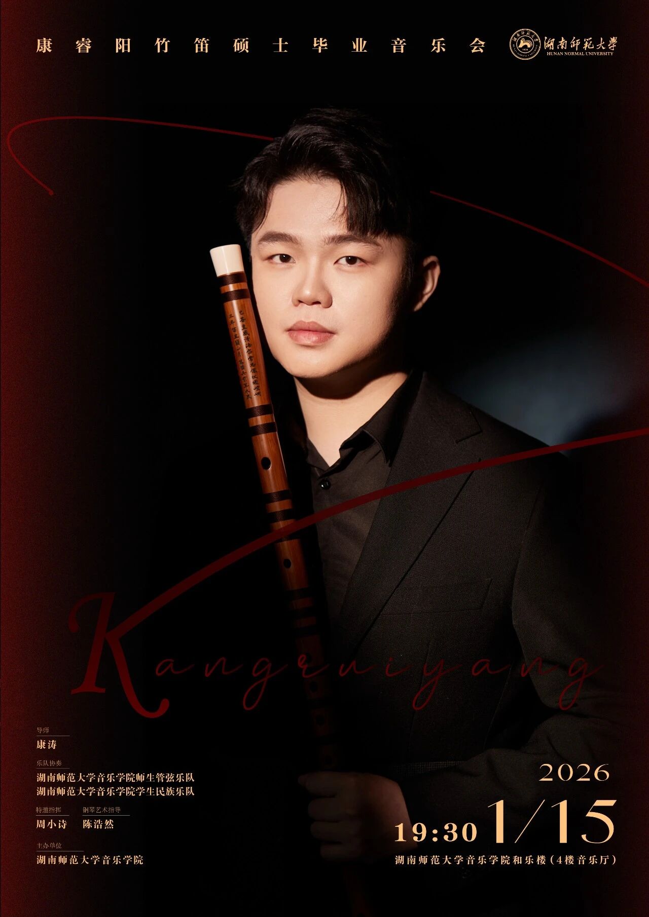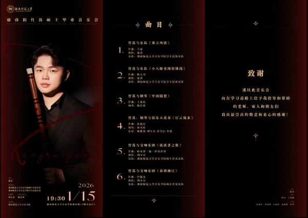 2026年1月15日晚,湖南师范大学音乐学院康睿阳竹笛硕士毕业音乐会在本学院和乐楼音乐厅成功举行,音乐会现场座无虚席。2026年1月15日晚,湖南师范大学音乐学院康睿阳竹笛硕士毕业音乐会在本学院和乐楼音乐厅成功举行,音乐会现场座无虚席。湖南艺术职业学院校长周邦春先生,湖南省民族管弦乐学会竹笛专业委员会会长、一级演奏家刘汉华先生,湖南省音乐家协会管弦乐学会会长、湖南师范大学音乐学院博导、器乐系主任陈果教授等专家做为评委和观众汇聚一堂,共享音乐艺术盛宴,见证康睿阳在竹笛专业道路上的成长里程碑。