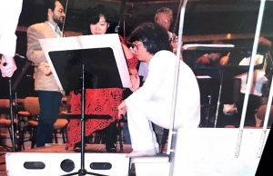 姜建华(最右)与小泽征尔(中)正为三得利音乐厅开幕演出排练中