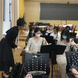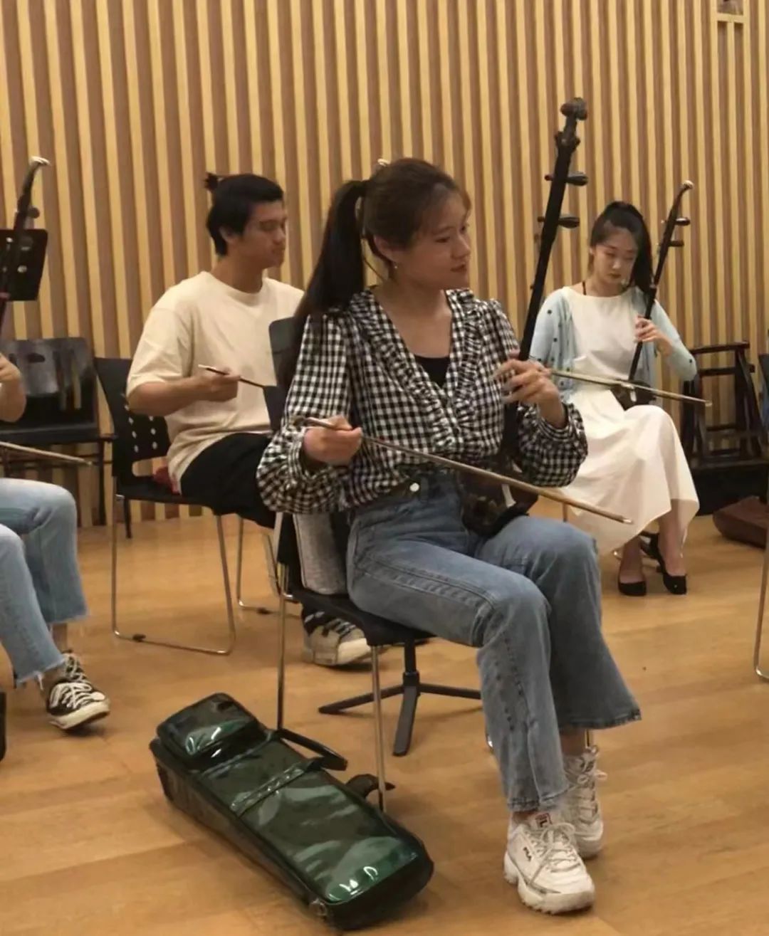 图左1:浙江音乐学院青年二胡教师薛辰茜担任浙江音乐学院二胡艺术研究中心“忆江南”弦乐团首席,并常常帮助各声部排练指导