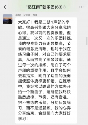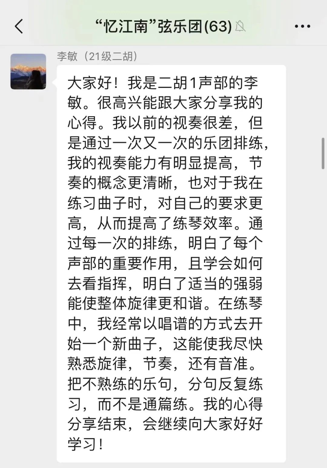 “忆江南”弦乐团的成员们纷纷表示在弦乐团排练收获满满,视奏能力有明显的提升,节奏、音准也掌握得更准确,学会了强弱关系的处理,更学会了如何看指挥,了解乐团排练与个人训练的区别等技巧和方法,也为今后在职业乐团发展奠定了良好的基础,具有较强的实用性。