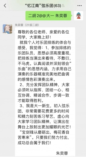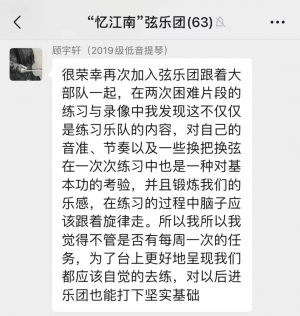 尽管每周排练任务较重,但成员们都非常期待“忆江南”弦乐团的排练,一直保持积极饱满的态度全身心投入到排练中,他们一起训练,刻苦努力,互相学习,共同进步。