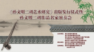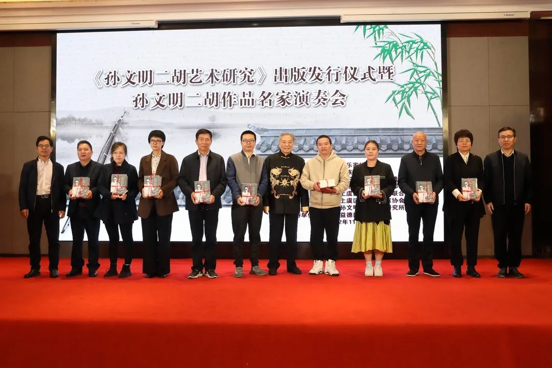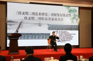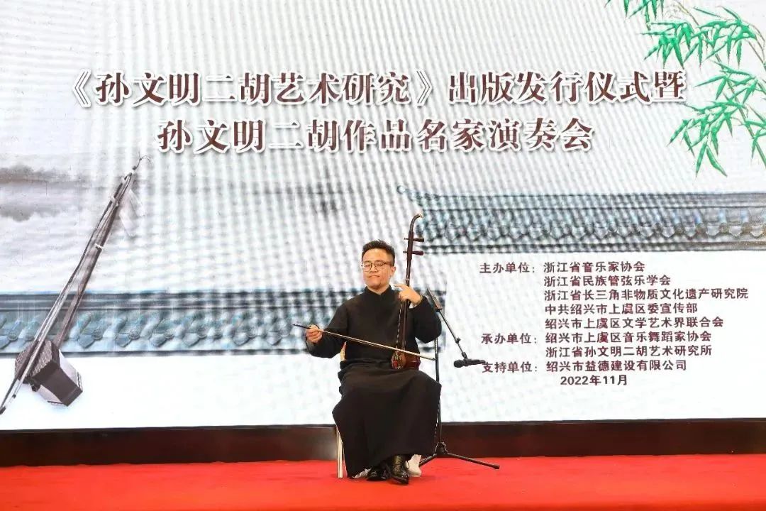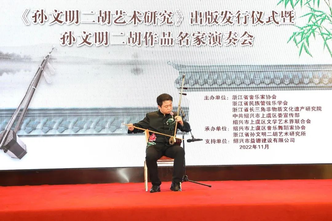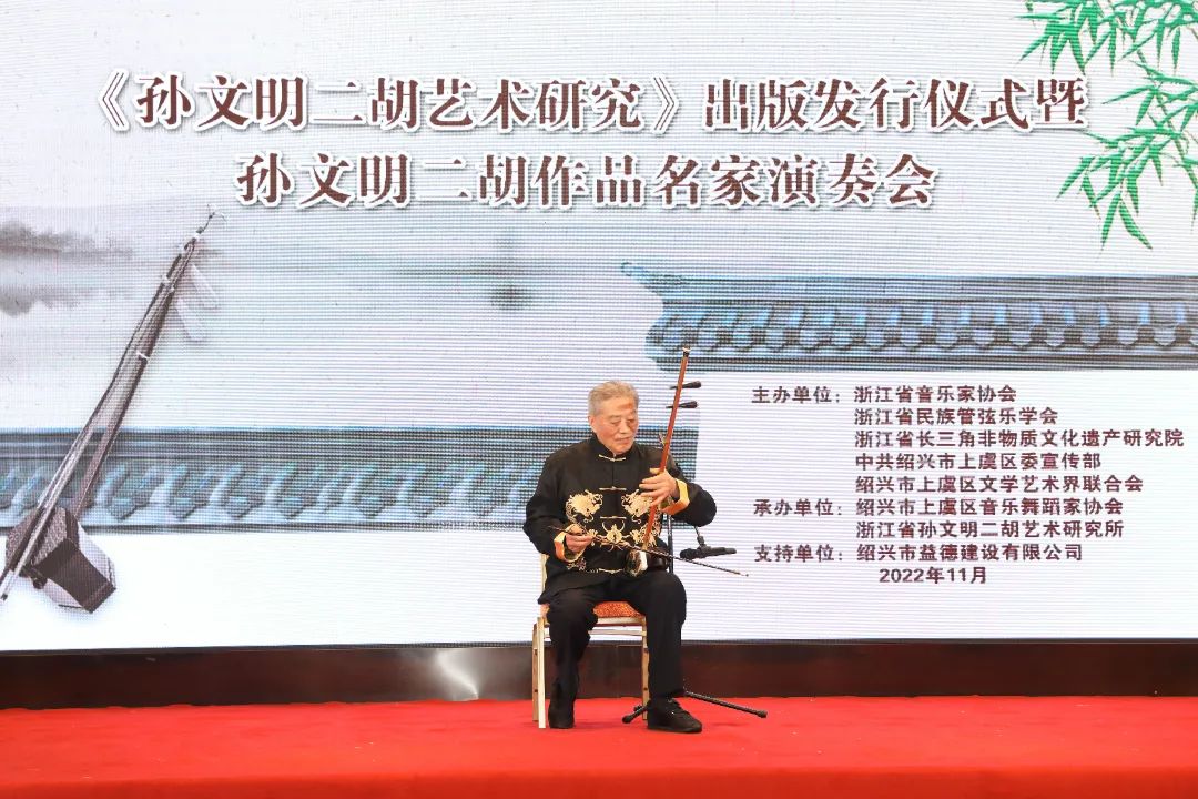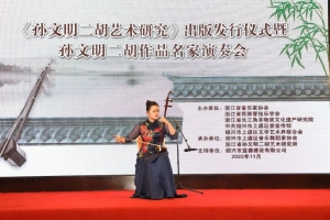 11月20日上午,由浙江省音乐家协会、浙江省民族管弦乐学会、浙江省长三角非物质文化遗产研究院、上虞区委宣传部、上虞区文联共同主办,上虞区音乐舞蹈家协会、浙江省孙文明二胡艺术研究所联合承办的《孙文明二胡艺术研究》出版发行仪式暨孙文明二胡作品名家演奏会在故乡上虞隆重举行,上虞区委常委、宣传部长周晓国,区政协副主席章颖芳,区委宣传部副部长、新闻办主任谢晓峰,区政协教体和文史委主任徐彪,区教体局党委书记、局长房永军,区文联党组书记、主席徐伟军等领导,浙江音乐学院戏剧系主任、浙江省民族管弦乐学会会长、国家一级作曲家刘建宽,浙江省长三角非物质文化遗产研究院研究员、孙文明二胡艺术研究所所长、胡琴演奏家孙以诚,杭州师范大学音乐学院研究生与科研部主任、副教授余鑫、绍兴市艺术研究院院长李明兴,江西省南昌大学青年二胡演奏家黄海,南京师范大学二胡演奏家王诗泉,安徽省民族管弦乐学会理事、二胡演奏家聂传奇,湖南省长沙市二胡学会副秘书长、二胡演奏家王刚等我国二胡艺术研究领域重量级的专家学者、演奏名家及孙文明的女儿潘音月等出席发行仪式。发行仪式前晚,还举行《孙文明二胡艺术研究》出版座谈研讨会,在场众多专家学者畅所欲言,均对孙文明二胡艺术发表独到见解,对《孙文明二胡艺术研究》的出版表示了祝贺与肯定。