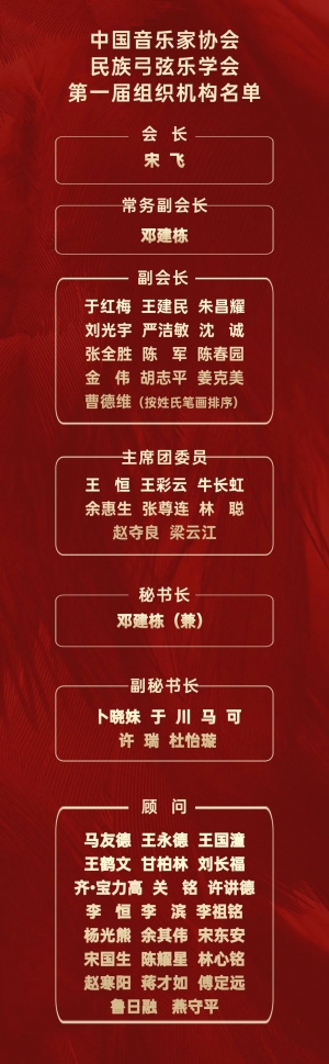 接下来,民族弓弦乐学会将立足业界发展实际,结合本场演出并以此为起点,充分发挥中国音协专业学会的组织优势和专业优势,展现民族弓弦艺术界凝心聚力、自信自强、守正创新、踔厉奋发、勇毅前行的精神风貌和使命担当,传承弘扬中华优秀传统文化,讲好中国故事,传播中国声音,推动我国民族弓弦乐在新时代新征程上创造更大辉煌。