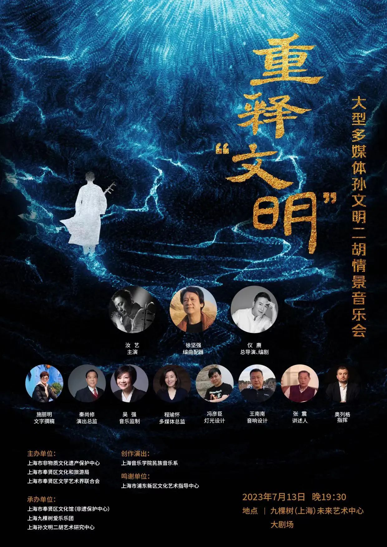 7月13日晚,在九棵树未来艺术中心,将上演由上海音乐学院民族音乐系联合上海市非物质文化遗产保护中心、上海市奉贤区文化和旅游局、上海市奉贤区文学艺术界联合会等共同打造的《重释“文明”》——大型多媒体孙文明二胡情景音乐会。音乐会为上海市文化基金会重大文艺创作项目,以音渲情,景情交揉,重新奏响时代记忆,敬一代琴师孙文明,展上海音乐学院江南二胡教学研究成果,创传统艺术之新生。