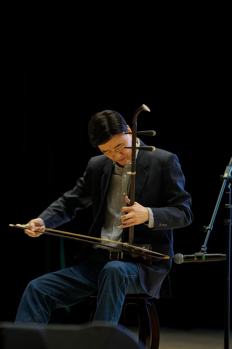 随后,朱昌耀主席重点讲解了二胡艺术发展的重要土壤——江南丝竹音乐,深入浅出地阐述了江南丝竹与江南风格二胡演奏的独特韵味。为了更直观地展现二胡艺术之美,讲座采用了边讲边演、赏析结合的方式。朱昌耀主席现场演奏了其创作的《江南春色》《苏南小曲》《扬州小曲》三首充满江苏风情的二胡作品。优美、委婉、细腻的旋律,仿佛将人们带入了江南水乡的美景之中,让师生们领略到了苏南、苏北二胡曲的不同风格特点,感受到了江南音乐的独特魅力。