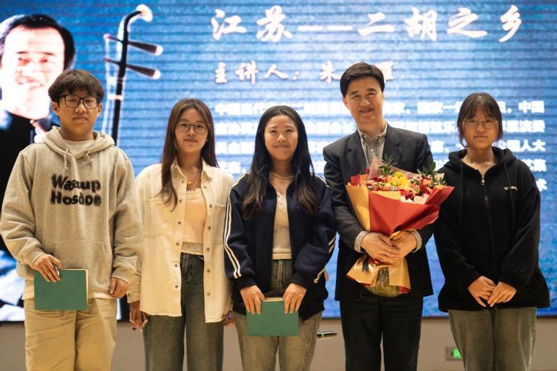 朱昌耀主席从二胡的悠久历史谈起,结合相关文献记载,深入剖析了二胡艺术与江苏历史文化的紧密联系,详细介绍了江苏籍二胡大师刘天华、阿炳在二胡发展史上的杰出贡献,以及二十世纪以来,江苏这片沃土上涌现出的众多杰出二胡演奏家。他的讲述生动鲜活,仿佛带领师生们穿越时空,亲身感受江苏二胡艺术的无穷魅力。