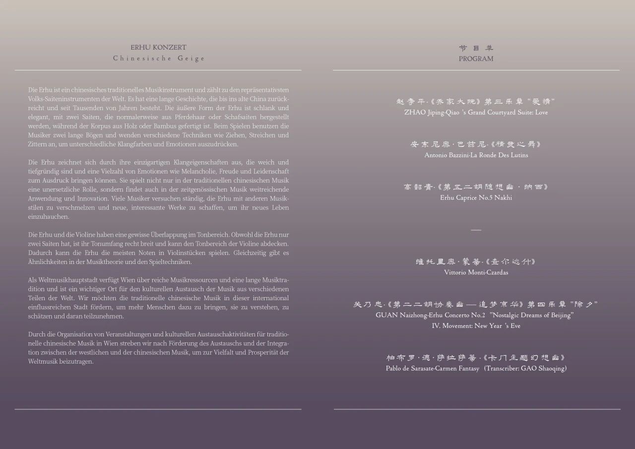 马可,作为中国音乐学院优秀青年二胡教师,曾荣获第八届中国音乐金钟奖民乐二胡比赛金奖,并被央视CCTV评为新十大二胡演奏家之一,2021年曾获批国家艺术基金青年艺术创作人才舞台艺术表演项目资助。此次维也纳之行,她精心挑选了包括《乔家大院——爱情》《第五二胡随想曲——纳西》以及《第二二胡协奏曲——追梦京华》多首中国优秀的二胡作品。同时,她还大胆挑战难度超高,移植自世界著名小提琴曲的《卡门主题幻想曲》《精灵之舞》《查尔达什》,为世界音乐之都的维也纳观众带来了耳目一新的听觉体验。
