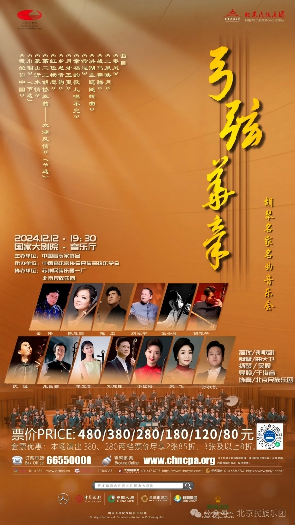2024年12月12日晚,“弓弦华章”——胡琴名家名曲音乐会于国家大剧院音乐厅精彩亮相,本场音乐会由中国音乐家协会主办、中国音乐家协会民族弓弦乐学会承办、苏州民族乐器一厂协办、北京民族乐团担任协奏,为乐迷朋友们呈现了一场“天花板”级别的民族弓弦音乐会!