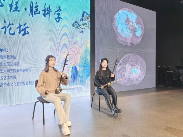 宋飞在发言中强调,出色的音乐演奏并不仅仅依赖于技术技巧,而且需要想象、联想和移情等丰富的心理活动的参与。随后,宋飞携两位学生在论坛现场演示了目前国际上最先进的音乐脑活动可视化科学实验。两位二胡表演者分别佩戴国际最先进的脑电采集装置进行现场演奏,装置采集的信号实时地通过大屏幕将表演者在音乐演奏过程中所体会和传递出的不同情感信息通过大脑各个区域激活程度对比鲜活直观地呈现在与会者眼前。