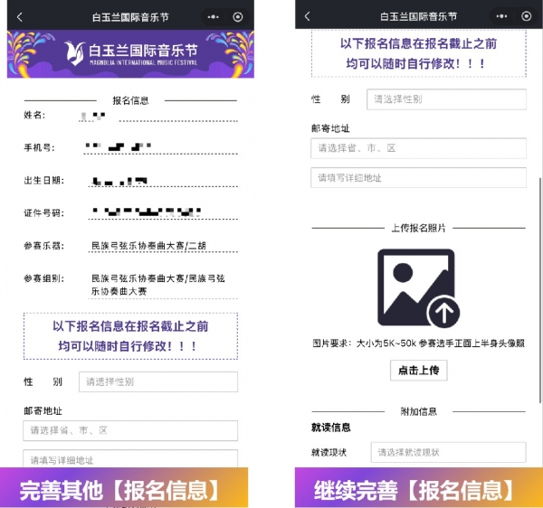 2、请严格按照章程要求,完整、准确的填写报名信息,并保证其真实性,参赛选手须对自己所报的年龄、组别、曲目等资料的真实性和正确性负全部责任,如发现有上报虚假或错误信息的按违规处理,组委会有权取消其参赛资格,产生一切后果由选手承担。若对章程内容存疑,可以咨询组委会客服。